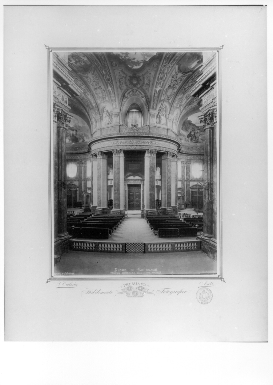 - ISCRIZIONI sul supporto primario: recto: in basso - "Affreschi di P. Gaidano - Duomo di Carignano - Veduta generale dall'Altare Maggiore - Arch.a di B. Alfieri" - Ecclesia Vittorio -