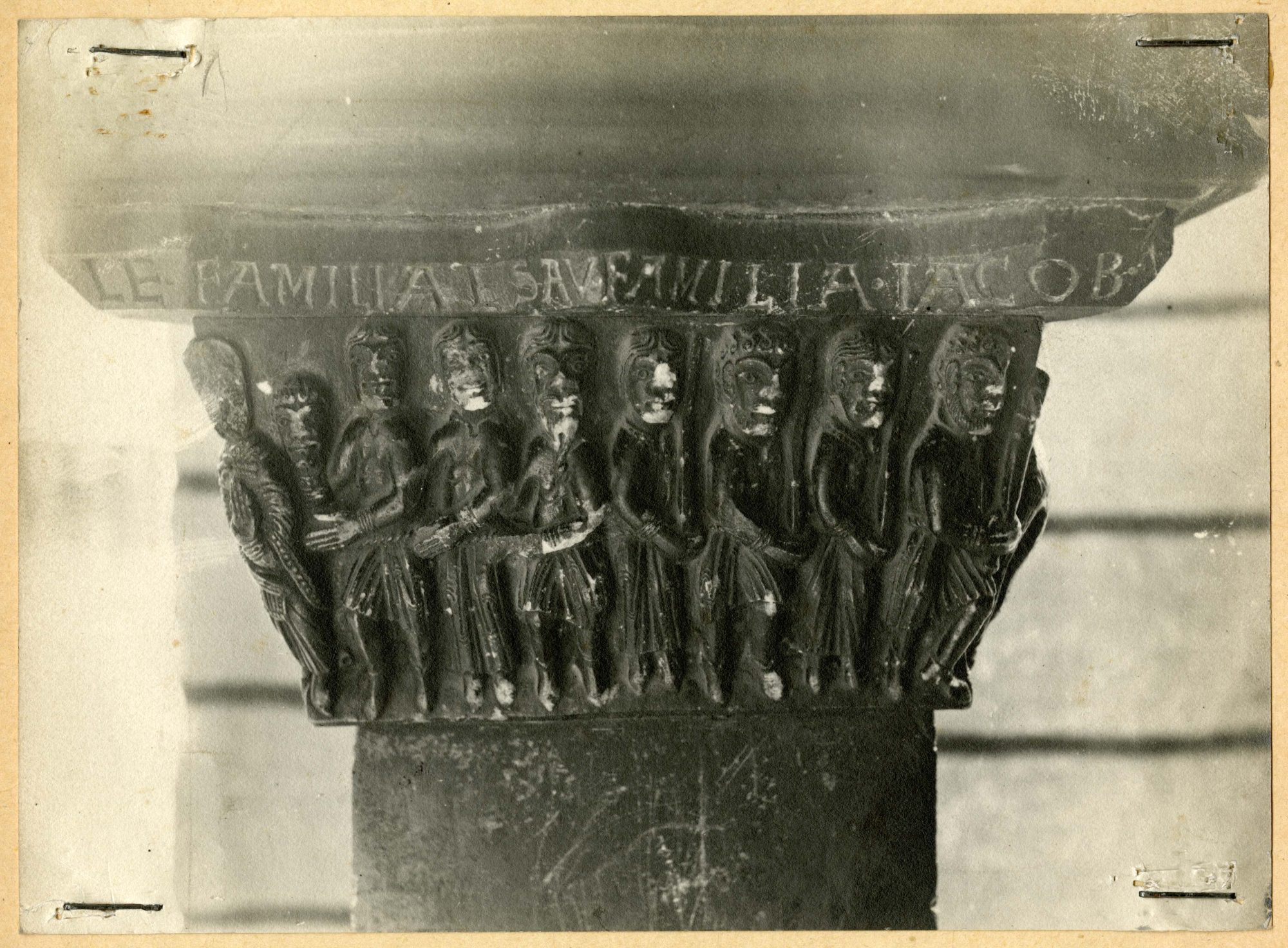 Aosta (AO)/ Sant'Orso = chiostro = capitello 19 = lato ovest AO - Aosta - Collegiata dei Santi Pietro e Orso - Chiostro - Capitello n. 19 - prospetto ovest: Incontro e riappacificazione di Giacobbe e Esaù, figure delle famiglie