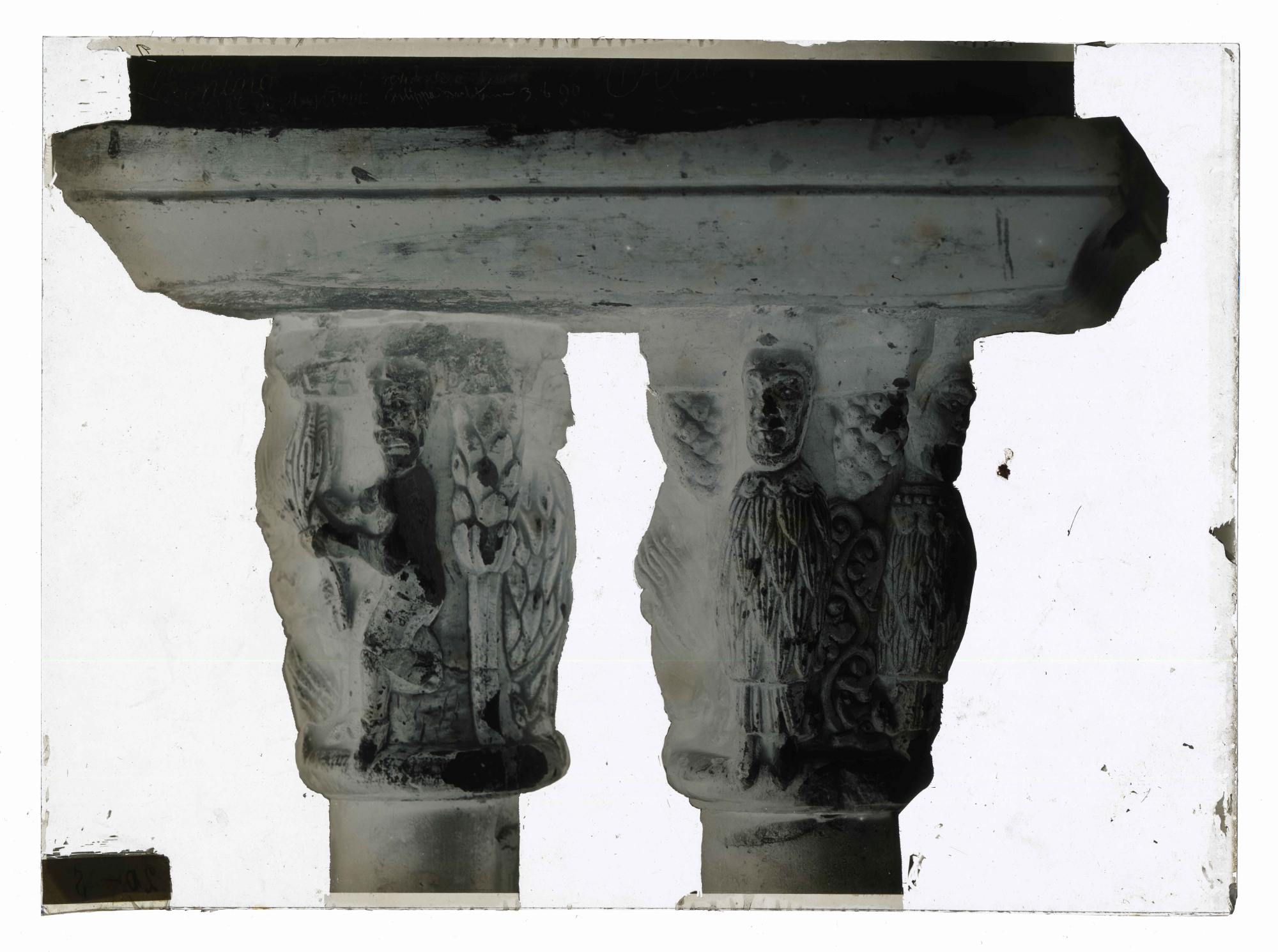 Aosta (AO)/ Sant'Orso = chiostro/ capitelli n.20/ = lato sud (cap. di destra verso/ il cortile) AO - Aosta - Collegiata dei Santi Pietro e Orso - Chiostro - Capitello n. 20 binato - prospetto sud: Rachele ruba gli idoli di Labano e Figli di Giacobbe
