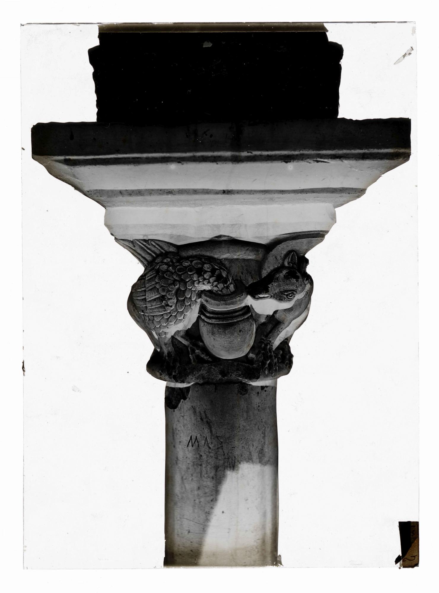 Aosta (AO)/ Sant'Orso = chiostro = 12°/ capitello = lato sud AO - Aosta - Collegiata dei Santi Pietro e Orso - Chiostro - Capitello n. 12 - prospetto sud: Favola della cicogna e della volpe