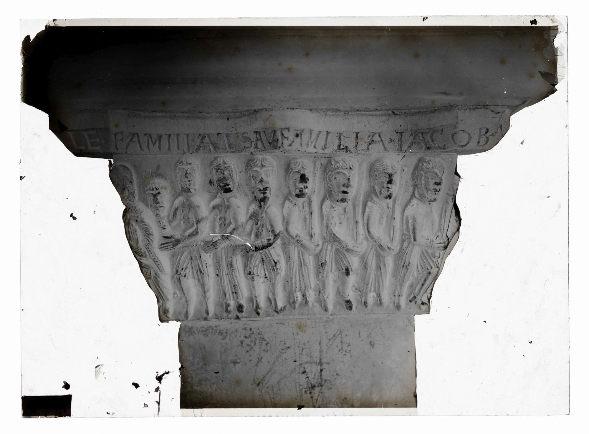 Aosta (AO)/ Sant'Orso = chiostro/ capitello 19° = lato ovest AO - Aosta - Collegiata dei Santi Pietro e Orso - Chiostro - Capitello n. 19 - prospetto ovest: Incontro e riappacificazione di Giacobbe e Esaù, figure delle famiglie