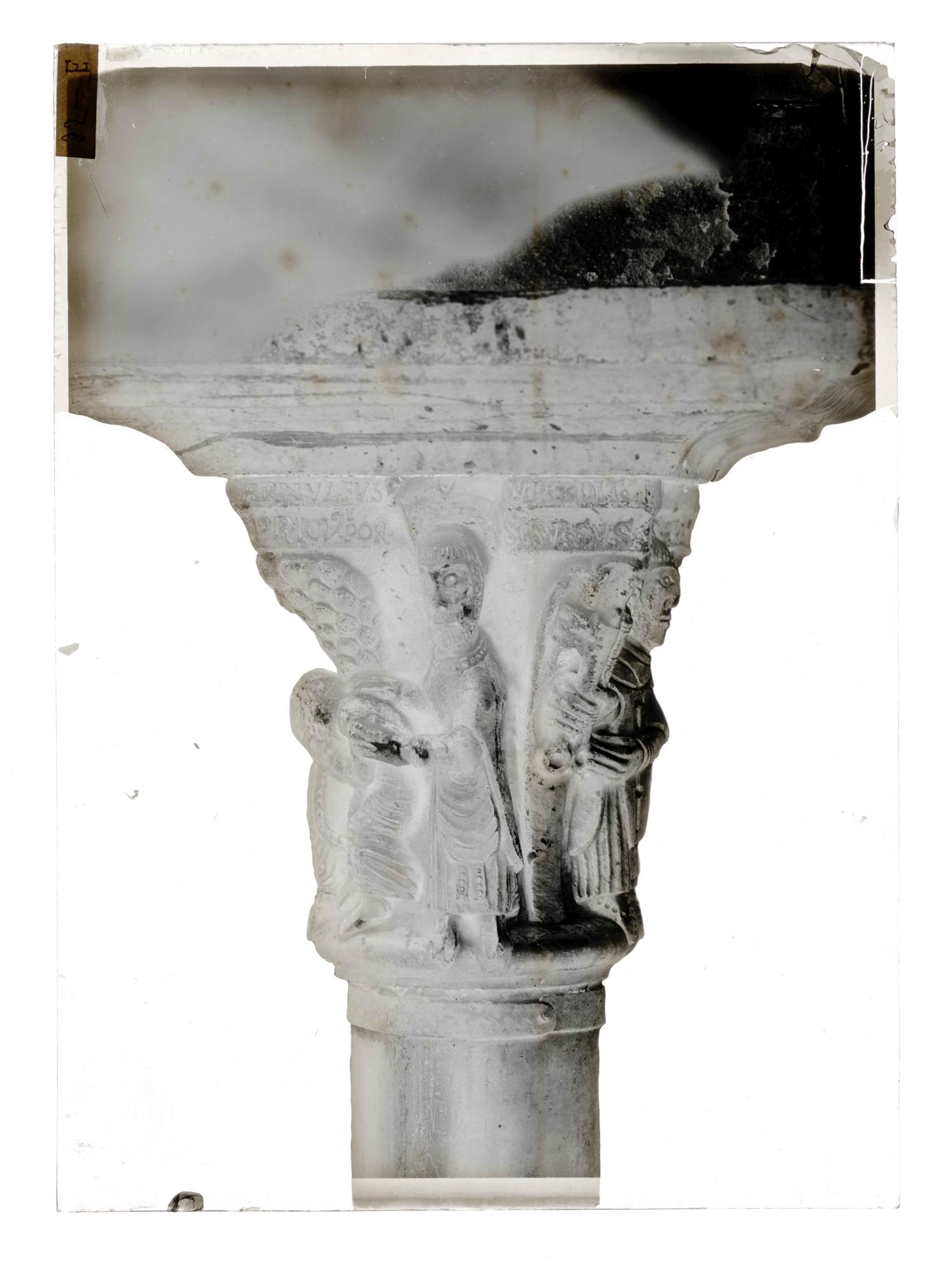 Aosta (AO)/ Sant'Orso = chiostro = / capitello 35° = lato est AO - Aosta - Collegiata dei Santi Pietro e Orso - Chiostro - Capitello n. 35 - prospetto est: Arnolfo presentato da S. Orso è consacrato priore