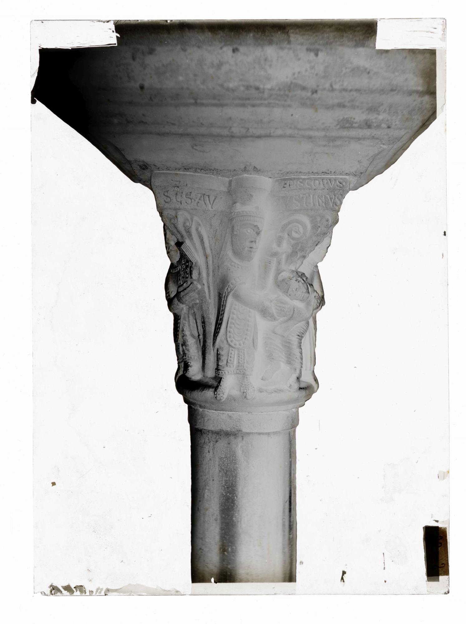 Aosta (AO)/ Sant'Orso = chiostro / capitello 35° = lato sud AO - Aosta - Collegiata dei Santi Pietro e Orso - Chiostro - Capitello n. 35 - prospetto sud: Arnolfo è consacrato priore, figura di S. Agostino