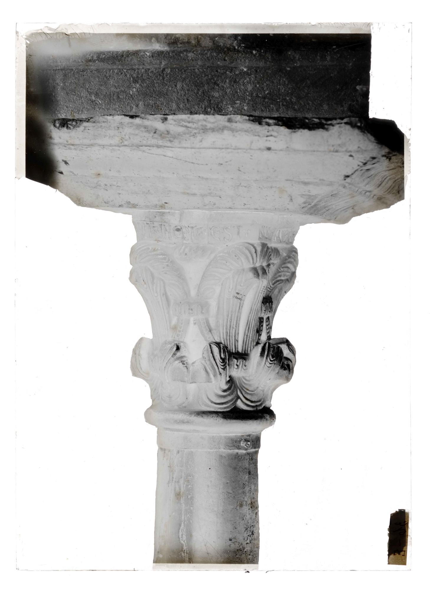 Aosta (AO)/ Sant'Orso = chiostro / capitello 36= lato est AO - Aosta - Collegiata dei Santi Pietro e Orso - Chiostro - Capitello n. 36 - prospetto est: iscrizione commemorativa della fondazione del capitolo