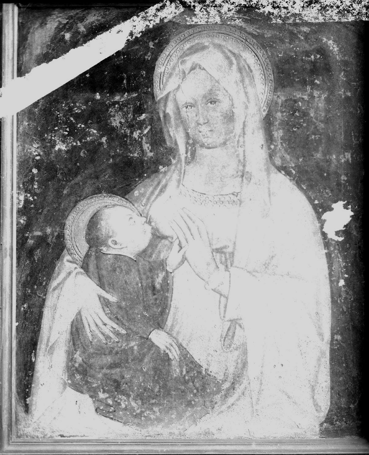 - NOTIZIE STORICO CRITICHE Sulla lastra negativa compare un'iscrizione che attribuisce il dipinto a Lorenzo Leonbruno e lo colloca nella Sala dei Cavalli. Evidentemente si tratta di un errore poiché durante il restauro della Sala dei Cavalli fu effettivamente rinvenuto un frammento di pittura murale alla maniera dell'artista ma raffigurante un paesaggio con labirinto d'acqua, senza alcun riferimento al dipinto raffigurato nella lastra in esame. L'affresco proviene da Casa Fiera (Mantova), lo strappo fu realizzato nel 1852, anno in cui passò al Palazzo Accademico fino al 1915. In seguito presso Palazzo Ducale risulta sottoposto a restauro solo nel 1946 (Carlo Andreani). Lo scatto riprende il dipinto entro una cornice in legno e lo stato conservativo complessivo risulta assai mediocre: numerose sono le lacune e l'intera gamma cromatica del dipintomanca di leggibilità. Si ipotizza dunque un arco cronologico di produzione dello scatto che va dal 1915, anno di ingresso del dipinto al Ducale, e il 1946, anno del primo restauro dopo lo strappo