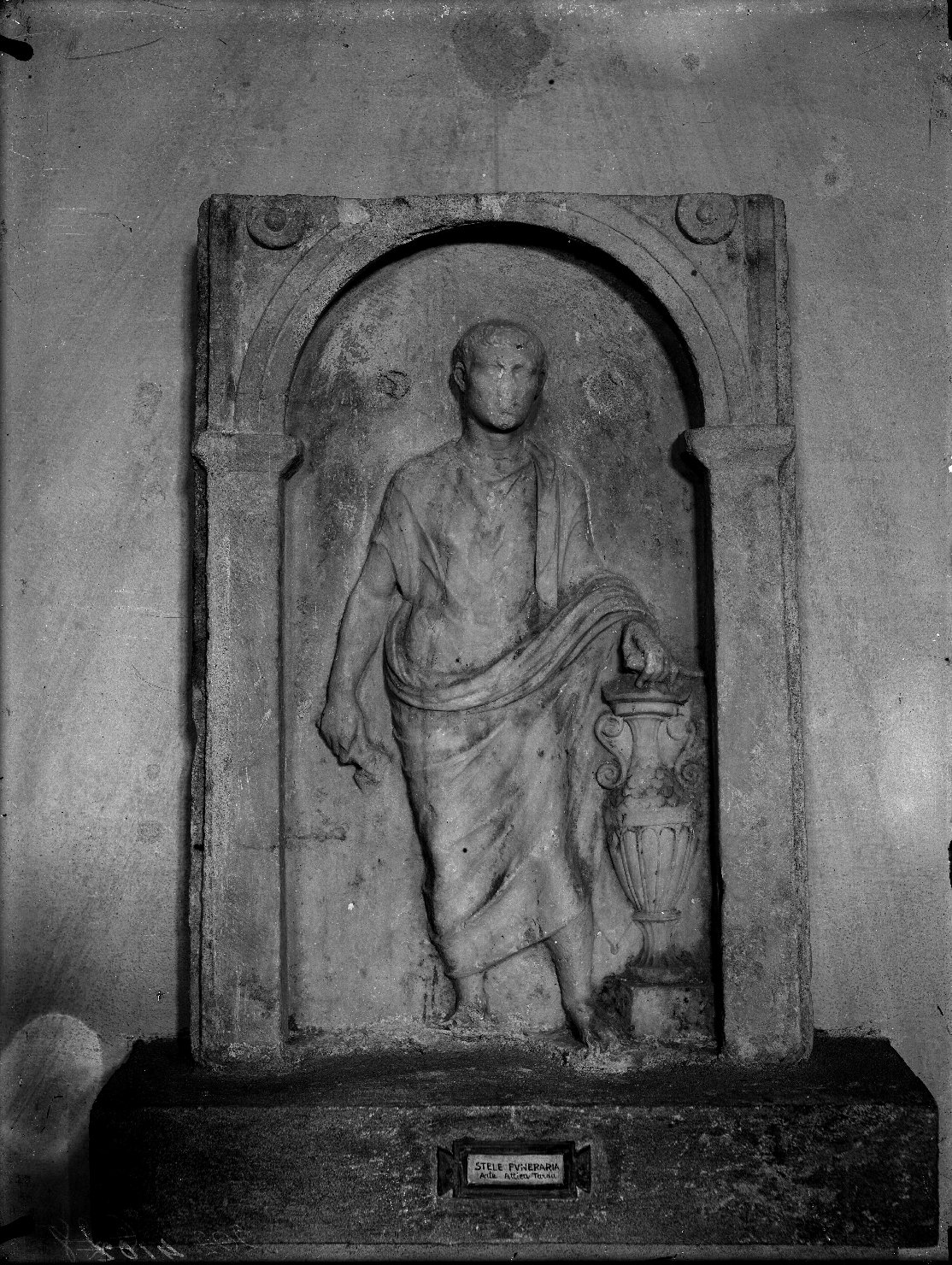 - NOTIZIE STORICO CRITICHE La lastra mostra una stele in marmo pentelico originaria forse di Atene o dell'Attica. Datata al II quarto del I secolo d.C., faceva parte probabilmente del gruppo di sculture di manifattura greca acquistate a Venezia nel 1661 dagli eredi di Federico Contarini per conto di Carlo II Gonzaga Nevers. Giunse alla fine del 1700 al Museo dell'Accademia dalla Villa Favorita e fu poi depositata a Palazzo Ducale a seguito della Convenzione tra Stato e Comune dell'11 marzo 1915, terminus post quem per datare il nostro scatto (Alda Levi, Sculture greche e romane del Palazzo ducale di Mantova, Roma, Biblioteca d'arte, 1931, n. 53, pp. 36-37, tav. XXXIXa; Ugo Bazzotti, Ivana Freddi, Il Museo dell'Accademia, in Mantova nel Settecento, Milano, Electa, 1983, pp. 98-103; I marmi greci. Rilievi greci e neoattici, a cura di Federico Rausa, Mantova Tre lune, 2000, n. 11, pp. 68-69). Con tale Convenzione il Comune di Mantova cedette allo Stato le proprie collezioni di sculture antiche, medievali e rinascimentali, di dipinti, di monete e medaglie, di curiosità e stampe e il museo del Risorgimento. L'allestimento delle collezioni, nonché degli ambienti di Palazzo Ducale destinati a raccoglierle, venne a lungo dibattuto, iniziato non prima del 1920 e portato a termine entro gli anni '30