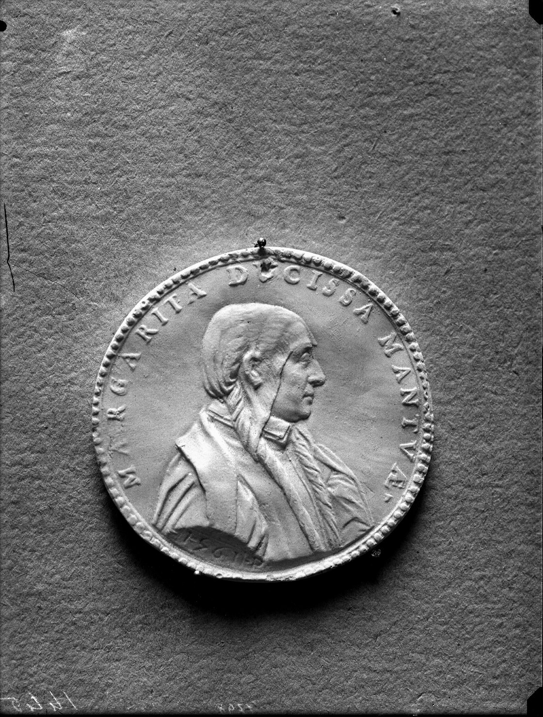 - NOTIZIE STORICO CRITICHE La lastra riproduce la medaglia realizzata da Pastorino Pastorini per Margehrita Paleologo Gonzaga, moglie di Federico II Gonzaga e prima duchessa di Mantova. Si tratta dell'unico ritratto certo di Margerita, con velo vedovile (cfr.Splendours of the Gonzaga, catalogue, edited by David Chambers & Jane Martineau, Exhibition 4 ovember 1981-31 January 1982, Victoria & Albert Museum, London, Cinisello Balsamo (Milano), Amilcare Pizzi, 1981, p.181, scheda 145). Cfr anche Alessandro Luzio, Mostra iconografica gonzaghesca, 16 maggio-19 settembre 1937, Mantova, Tip. L'Artistica, 1937, p. 26, n. cat. 115 (in occasione della mostra iconografica fu esposto un esemplare della Pinacoteca di Brera, Milano). Il Museo Numismatico fu allestito nelle prime sale dell'appartamento di Guastalla nel 1853, su sollecitazione di Carlo d'Arco, e poi nuovamente nell'inverno del 1925 da Alessandro Magnaguti, inaugurato il 22 aprile: Nino Giannantoni, Il Palazzo Ducale di Mantova, Roma, La Libreria dello Stato, 1929, pp.31-32)
