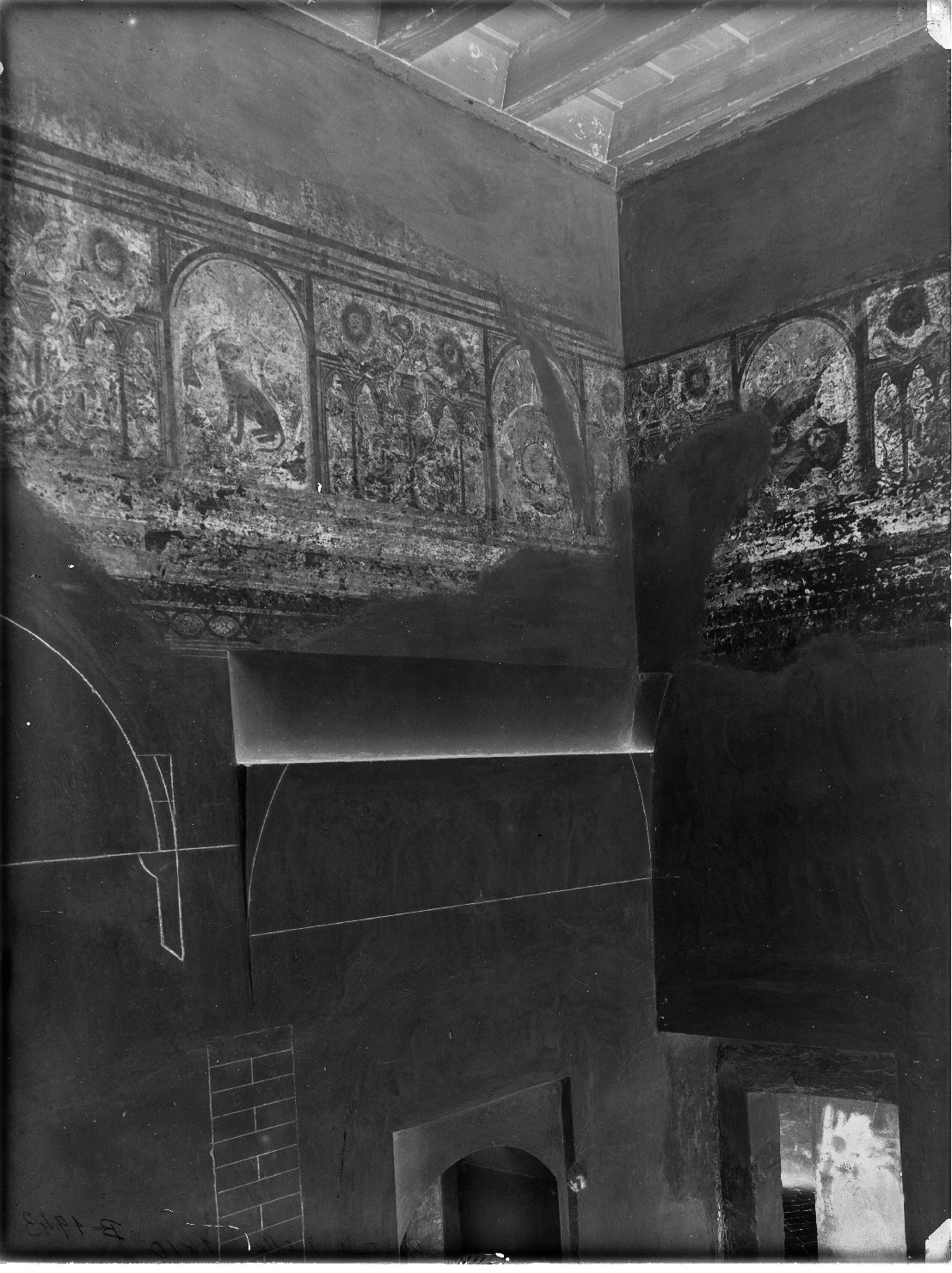 - NOTIZIE STORICO CRITICHE La lastra rappresenta l'angolo sud-ovest della terza stanza dell'Appartamento di Santa Croce (Renato Berzaghi, Il Palazzo Ducale di Mantova, Milano, Electa, 1992, p. 36), nella Corte Vecchia di Palazzo Ducale: si tratta di una metà dell'appartamento vedovile di Isabella d'Este, separata dal cosiddetto 'appartamento della Grotta' nel corso del XVIII secolo, indagata per la prima volta da Achille Patricolo (La conservazione del Palazzo ducale di Mantova e dei monumenti della provincia di mantova dal 1° aprile 1898 a tutto settembre 1903, Mantova, Tip. A. Mondovi & fig., 1904, pp.29-31), che ne porta alla luce alcune decorazioni, e che annuncia un futuro intervento, poichè gli ambienti risultano ancora in parte occupati dal Comitato mantovano della Croce Rossa (Achille Patricolo, Guida del Palazzo Ducale di Mantova, corredata di un album e d'una piccola pianta per cura del Comitato Palazzo Ducale, Mantova, Eredi Segna, 1908, pp.61-63). Ancora Giannantoni (Nino Giannantoni, Il Palazzo ducale di Mantova, Roma, La Libreria dello Stato, 1929, pp.11-12) pubblica la mappa del pianterreno di Corte Vecchia indicando le sale di questo appartamento genericamente come "Appartamento d'Isabella" e senza descriverle nel dettaglio. E' quindi presumibile che gli interventi in questa zona siano successivi (anni Trenta)