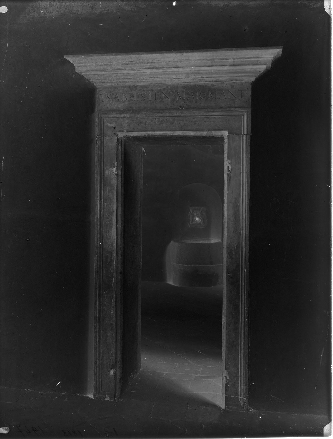 - NOTIZIE STORICO CRITICHE La lastra rappresenta il portale della Sala Grande (o Imperiale) dell'Appartamento di Santa Croce (Renato Berzaghi, Il Palazzo Ducale di Mantova, Milano, Electa, 1992, p. 36), nella Corte Vecchia di Palazzo Ducale: si tratta di una metà dell'appartamento vedovile di Isabella d'Este, separata dal cosiddetto 'appartamento della Grotta' nel corso del XVIII secolo, indagata per la prima volta da Achille Patricolo (La conservazione del Palazzo Ducale di Mantova e dei monumenti della provincia di mantova dal 1° aprile 1898 a tutto settembre 1903, Mantova, Tip. A. Mondovi & fig., 1904, pp. 29-31), che ne porta alla luce alcune decorazioni, e che annuncia un futuro intervento, poichè gli ambienti risultano ancora in parte occupati dal Comitato mantovano della Croce Rossa (Achille Patricolo, Guida del Palazzo Ducale di Mantova, corredata di un album e d'una piccola pianta per cura del Comitato Palazzo Ducale, Mantova, Eredi Segna, 1908, pp.61-63). Ancora Giannantoni (Nino Giannantoni, Il Palazzo ducale di Mantova, Roma, La Libreria dello Stato, 1929, pp.11-12) pubblica la mappa del pianterreno di Corte Vecchia indicando le sale di questo appartamento genericamente come "Appartamento d'Isabella" e senza descriverle nel dettaglio. E' quindi presumibile che gli interventi in questa zona siano successivi (anni Trenta)