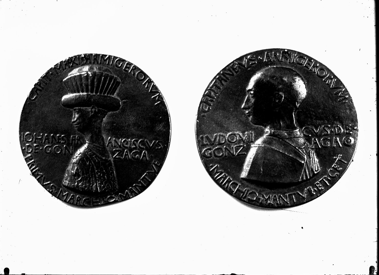 - NOTIZIE STORICO CRITICHE Lo scatto illustra il diritto delle due medaglie di Pisanello dedicate rispettivamente ai marchesi Gianfrancesco e Ludovico II Gonzaga, facenti parte del medagliere dato in custodia dal Comune di Mantova allo Stato nel 1915 tramite Convenzione. L'identificazione degli esemplari è stata possibile confrontando la posizione del foro praticato sul bordo di entrambe con quello dei reperti mantovani, attualmente conservati a Palazzo Te. Poiché in occasione della Mostra iconografica gonzaghesca tenutasi a Palazzo Ducale del 1937 due esemplari delle stesse medaglie erano stati esposti (la medaglia di Gianfrancesco del Museo della Ca' d'Oro a Venezia, quella di Ludovico Gonzaga degli Uffizi) e dato che in tale occasione si era tenuta una vasta campagna fotografica sulle opere artistiche giunte a Mantova per l'occasione, si era inizialmente ipotizzato che proprio quelle medaglie fossero state i soggetti della lastra e che quella ne fosse la data di esecuzione (Mostra iconografica gonzaghesca. Catalogo delle opere - Mantova, Palazzo Ducale 16 maggio-19 settembre 1937, Mantova, L'Artistica, 1937, n. 33 a p. 9 e n. 45 a p. 11). Smentita dai fatti tale ipotesi, la datazione dello scatto va compresa tra la Convenzione stipulata nel 1915 fra Comune e Stato e il 1940, terminus ante quem di datazione stabilito dall'analisi tecnico-formale del negativo. Il Museo Numismatico, riorganizzato e sistemato dal Conte Alessandro Magnaguti, fu inaugurato il 22 maggio 1925 alla presenza di Re Vittorio Emanuele III. Esposto in tre sale dell'Appartamento di Guastalla, opportunamente restaurate, intorno alla metà del XIX secolo fece ritorno nei depositi del Ducale. Parte dei reperti (tra i quali le presenti medaglie) fu però trasferita nel 1985 a Palazzo Te, dove diede vita alla "Sezione gonzaghesca" di monete, medaglie, pesi e misure mantovane nell'età dei Gonzaga". (La sezione gonzaghesca. Monete, medaglie, pesi e misure mantovane nell'età dei Gonzaga, a cura di Alia Englen [et al.], Mantova, Museo Civico di Palazzo Te, 1987, pp. 136-137, nn. 1-2; Giannino Giovannoni, Paola Giovetti, Medaglisti nell'età di Mantegna e il trionfo di Cesare, Canneto sull'Oglio, Eurograf, 1992, pp. 44-45)