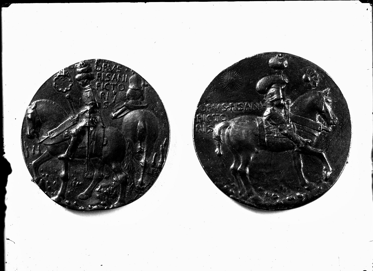 - NOTIZIE STORICO CRITICHE Lo scatto illustra il rovescio delle due medaglie di Pisanello dedicate rispettivamente ai marchesi Gianfrancesco e Ludovico II Gonzaga, facenti parte del medagliere dato in custodia dal Comune di Mantova allo Stato nel 1915 tramite Convenzione. L'identificazione degli esemplari è stata possibile confrontando la posizione del foro praticato sul bordo di entrambe con quello dei reperti mantovani, attualmente conservati a Palazzo Te. Poiché in occasione della Mostra iconografica gonzaghesca tenutasi a Palazzo Ducale del 1937 due esemplari delle stesse medaglie erano stati esposti (la medaglia di Gianfrancesco del Museo della Ca' d'Oro a Venezia, quella di Ludovico Gonzaga degli Uffizi) e dato che in tale occasione si era tenuta una vasta campagna fotografica sulle opere artistiche giunte a Mantova per l'occasione, si era inizialmente ipotizzato che proprio quelle medaglie fossero state i soggetti della lastra e che quella ne fosse la data di esecuzione (Mostra iconografica gonzaghesca. Catalogo delle opere - Mantova, Palazzo Ducale 16 maggio-19 settembre 1937, Mantova, L'Artistica, 1937, n. 33 a p. 9 e n. 45 a p. 11). Smentita dai fatti tale ipotesi, la datazione dello scatto va compresa tra la Convenzione stipulata nel 1915 fra Comune e Stato e il 1940, terminus ante quem stabilito dall'analisi tecnico-formale del negativo. Il Museo Numismatico, riorganizzato e sistemato dal Conte Alessandro Magnaguti, fu inaugurato il 22 maggio 1925 alla presenza di Re Vittorio Emanuele III. Esposto in tre sale dell'Appartamento di Guastalla, opportunamente restaurate, intorno alla metà del XIX secolo fece ritorno nei depositi del Ducale. Parte dei reperti (tra i quali le presenti medaglie) fu però trasferita nel 1985 a Palazzo Te, dove diede vita alla "Sezione gonzaghesca" di monete, medaglie, pesi e misure mantovane nell'età dei Gonzaga". (La sezione gonzaghesca. Monete, medaglie, pesi e misure mantovane nell'età dei Gonzaga, a cura di Alia Englen [et al.], Mantova, Museo Civico di Palazzo Te, 1987, pp. 136-137, nn. 1-2; Giannino Giovannoni, Paola Giovetti, Medaglisti nell'età di Mantegna e il trionfo di Cesare, 1992, pp. 44-45)