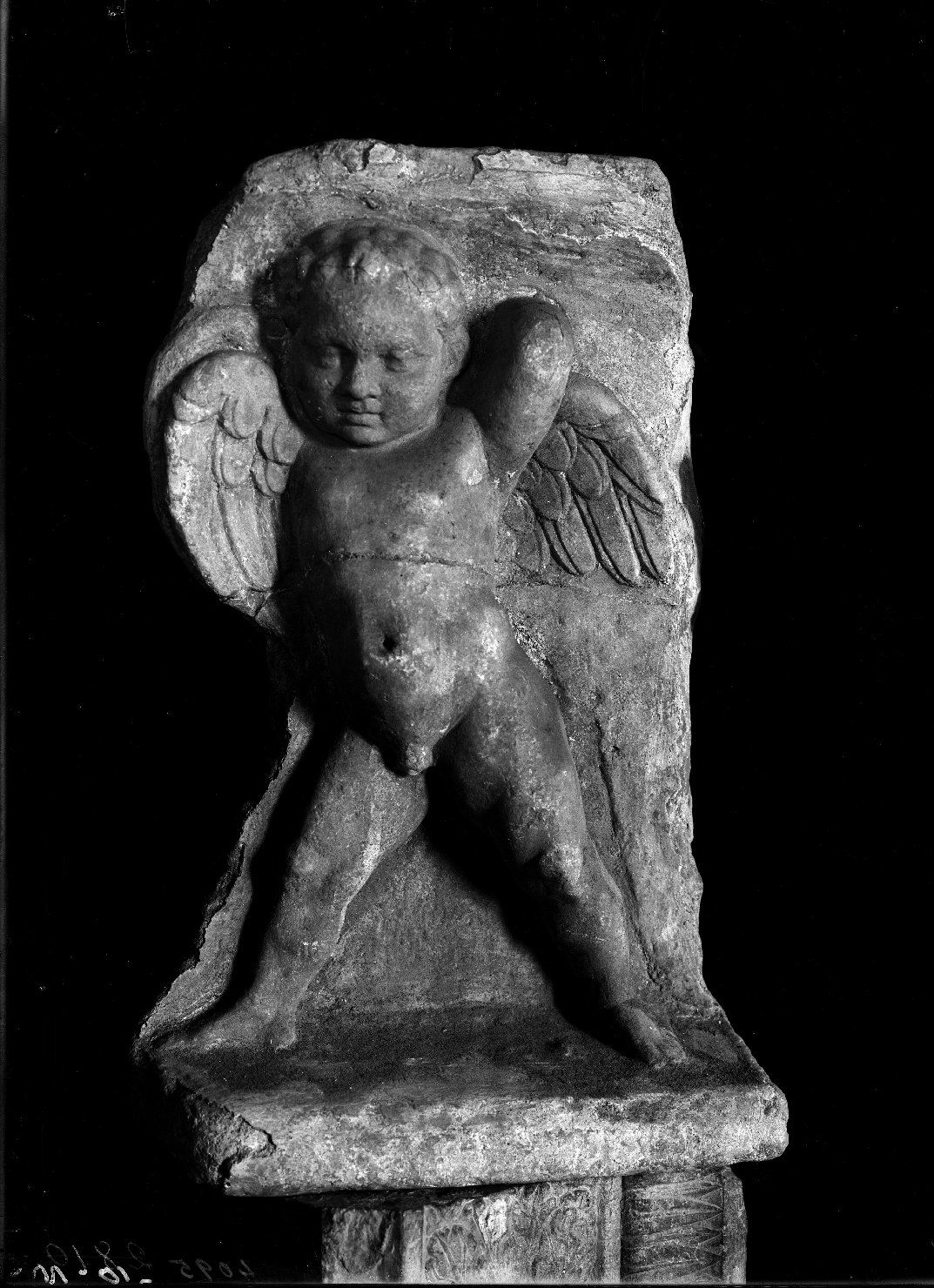 • NOTIZIE STORICO CRITICHE La lastra ritrae un rilievo rinascimentale raffigurante un amorino. La scultura è fra i reperti di proprietà comunale (già tradotti in Palazzo Ducale a seguito della Convenzione del 1915) che nel corso del 2004 furono trasferiti al Museo della Città di Palazzo San Sebastiano a Mantova (Mantova - il Museo della Città, a cura di Stefano Benetti, Gian Maria Erbesato, Chiara Pisani, Milano, Skira, 2005, pp. 80-81). Non possediamo elementi per stabilire una datazione precisa dello scatto. Anche se presumibilmente esso potrebbe essere stato eseguito a ridosso degli allestimenti di materiali antichi, medievali e rinascimentali di cui la reggia gonzaghesca fu teatro fra 1925 e 1930, preferiamo mantenere una ipotetica datazione ampia, compresa fra la data della Convenzione e il terminus ante quem stabilito dall'analisi tecnico-formale del supporto in vetro. Del rilievo si occupò la prima volta Ozzola che nel suo catalogo oscilla però nell'attribuire l'opera alla scuola di Donatello in didascalia e a Pier Ilario [sic] Bonacolsi nella breve descrizione dell'opera (Leandro Ozzola, Il Museo d'Arte Medievale e Moderna del Palazzo Ducale di Mantova, Mantova, Tip. L'Industriale, 1950 (?), p. 39, n. 81 e fig. 78)