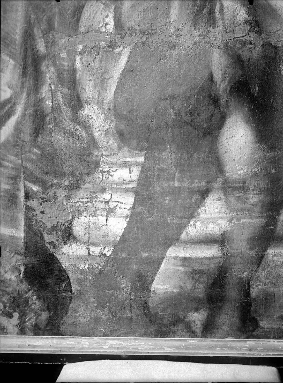• NOTIZIE STORICO CRITICHE La lastra fotografa una porzione della metà inferiore della cosiddetta Pala della Trinità di P.P. Rubens e precisamente l'area alle spalle della duchessa Margherita dei Medici e che si espande verso il basso e verso destra quasi a comprendere l'angolo della tela così come giunse a Palazzo Ducale (ovvero divisa in due quadri). La datazione dello scatto, in assenza di indizi materiali e documentari precisi, può essere unicamente compresa fra 1915 e 1940, ovvero tra la data di arrivo dell'opera a Palazzo Ducale e il terminus ante quem stabilito dall'analisi del supporto in vetro. L'area fotografata corrisponde a una delle zone laterali della metà inferiore dell'attuale dipinto. I frammenti superstiti di tale porzione furono saldati nel 1806 dando origine a un patchwork pittorico solo parzialmente coerente a completamento della figurazione centrale con i ritratti delle due coppie ducali. (Ugo Bazzotti, Precisazioni sulla Pala della Trinità di Mantova, in Rubens dall'Italia all'Europa, atti del convegno, Vicenza, Neri Pozza, 1992, pp. 39-48). Della dissezione cui fu sottoposta la grande pala destinata all'altar maggiore della chiesa della S.S. Trinità di Mantova fu responsabile Felice Campi, pittore e vicedirettore dell'Accademia di Belle Arti. Egli, col consiglio dell'incisore reggiano Rados, decise di sezionare la tela, passata in proprietà a un graduato francese e ormai irreparabilmente ammalorata dal contatto col fieno depositato nella chiesa. Nel 1806 il pittore Giuseppe Pellizza ricompose i frammenti come ancora oggi li vediamo. Dopo il restauro dell'Appartamento Ducale i due grandi frammenti del dipinto furono collocati nella Sala del Crogiolo, dove rimasero sino al 1940, quando trovarono nuova e (sino a oggi definitiva) collocazione nel salone degli Arcieri (Giuseppe Amadei, Incomparabili sculture greche e nuova regalità delle "Sale di Manto e degli Arcieri", "Mantus", a. VIII (1940), n. 1 (gennaio-febbraio), pp. 5-7). Per la pala si veda Stefano L'Occaso, Museo di Palazzo Ducale di Mantova. Catalogo generale delle collezioni inventariate. Dipinti fino al XIX secolo, Mantova, Publi Paolini, 2011, catt. 295-296, pp.255-262, tavv. XCII-XCIII