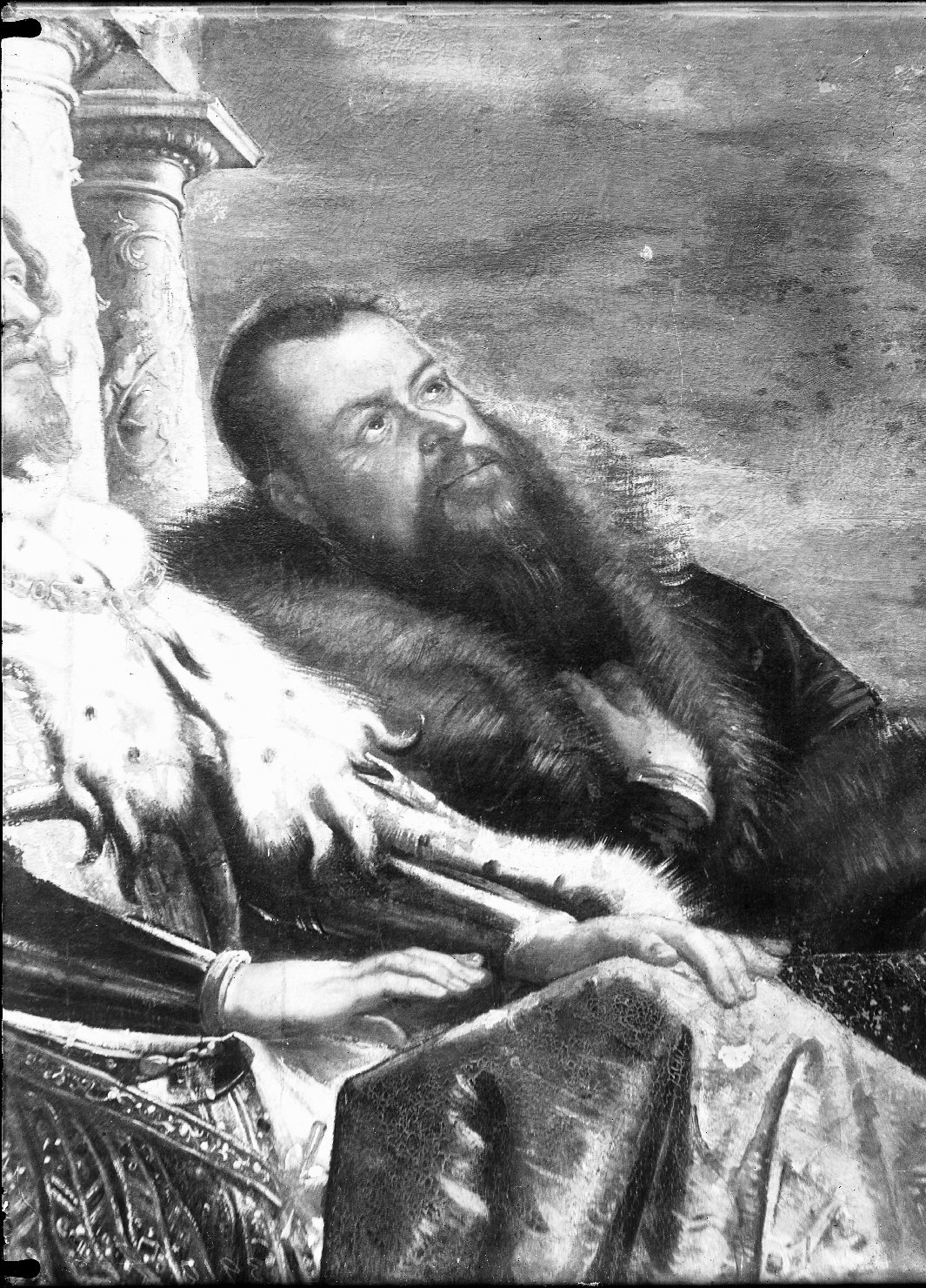 • NOTIZIE STORICO CRITICHE La lastra fotografa una porzione della metà inferiore della cosiddetta Pala della Trinità di P.P. Rubens e precisamente l'area comprendente il busto del duca Guglielmo Gonzaga e parte di quello del figlio Vincenzo I. La datazione dello scatto, in assenza di indizi materiali e documentari precisi, può essere unicamente compresa fra 1915 e 1940, ovvero tra la data di arrivo dell'opera a Palazzo Ducale e il terminus ante quem stabilito dall'analisi del supporto in vetro. L'area fotografata corrisponde a una delle zone laterali della metà inferiore dell'attuale dipinto. I frammenti superstiti di tale porzione furono saldati nel 1806 dando origine a un patchwork pittorico solo parzialmente coerente a completamento della figurazione centrale con i ritratti delle due coppie ducali. (Ugo Bazzotti, Precisazioni sulla Pala della Trinità di Mantova, in Rubens dall'Italia all'Europa, atti del convegno, Vicenza, Neri Pozza, 1992, pp. 39-48). Della dissezione cui fu sottoposta la grande pala destinata all'altar maggiore della chiesa della S.S. Trinità di Mantova fu responsabile Felice Campi, pittore e vicedirettore dell'Accademia di Belle Arti. Egli, col consiglio dell'incisore reggiano Rados, decise di sezionare la tela, passata in proprietà a un graduato francese e ormai irreparabilmente ammalorata dal contatto col fieno depositato nella chiesa. Nel 1806 il pittore Giuseppe Pellizza ricompose i frammenti come ancora oggi li vediamo. Dopo il restauro dell'Appartamento Ducale i due grandi frammenti del dipinto furono collocati nella Sala del Crogiolo, dove rimasero sino al 1940, quando trovarono nuova e (sino a oggi definitiva) collocazione nel salone degli Arcieri (Giuseppe Amadei, Incomparabili sculture greche e nuova regalità delle "Sale di Manto e degli Arcieri", "Mantus", a. VIII (1940), n. 1 (gennaio-febbraio), pp. 5-7). Per la pala si veda Stefano L'Occaso, Museo di Palazzo Ducale di Mantova. Catalogo generale delle collezioni inventariate. Dipinti fino al XIX secolo, Mantova, Publi Paolini, 2011, catt. 295-296, pp.255-262, tavv. XCII-XCIII