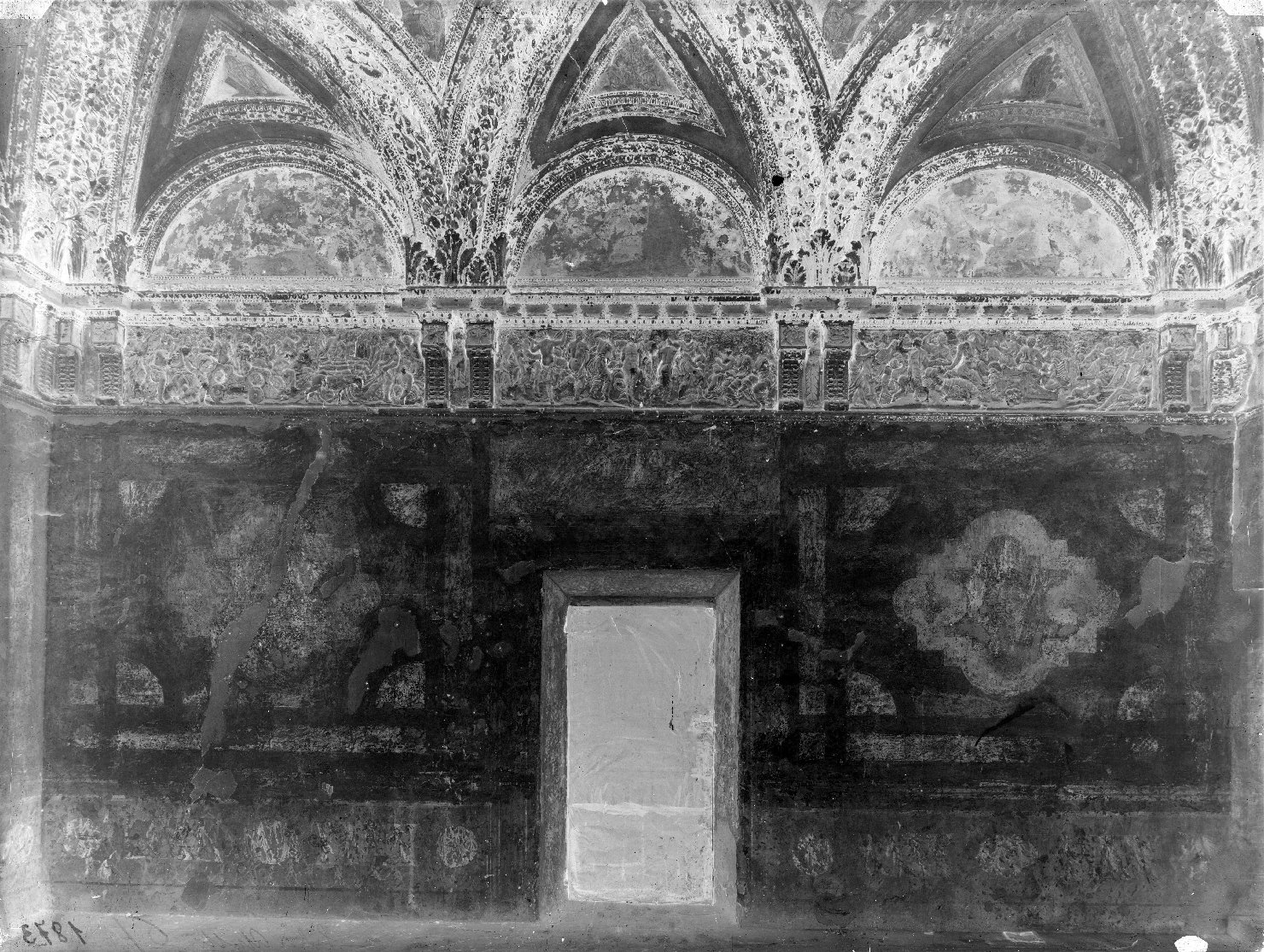 - NOTIZIE STORICO CRITICHE La camera delle Virtù appartiene all'Appartamento grande di Castello. Al centro del soffitto stava un' allegoria della musica, ora non più visibile, mentre le Virtù trovavano posto nelle lunette circondate da rilievi policromi in stucco. Al di sotto pannelli con strumenti musicali da collegarsi ai miti di Pan, Bacco e Apollo. Da qui prende il nome l'antica dicitura Sala di Apollo con cui Cottafavi descrive questo ambiente quando relaziona, nel 1931, sui lavori di restauro effettuati. Benché la stanza fosse uscita indenne dall'occupazione militare della prima guerra mondiale, le condizioni complessive erano pessime per i danni causati dalle intemperie sia sulle pitture murali che sugli stucchi in parte crollati. L'operazione di ripristino cercò di evitare ricostruzioni arbitarie intrevenendo solo con saldature e iniezioni di cemento, gesso o scagliola. Il restauro pittorico fu opera di Raffaldini che riuscì a rendere visibili otto delle dodici lunette. Lo scatto in esame documenta lo stato della sala prima del restauro, mostrando i visibili danni agli stucchi, lacune importanti e pitture illeggibili (Clinio Cottafavi, Mantova: palazzo Ducale, Appartamento del Tasso e Sala dei Duchi, in Bollettino d'Arte, Serie III, Agosto 1931, pp. 88-93) e si colloca cronologicamente negli anni che immediatamente precedono gli interventi di consolidamento e ripristino