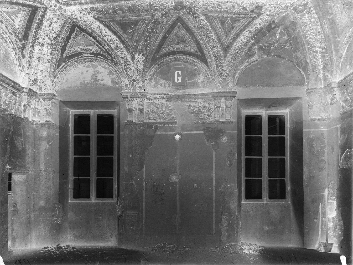- NOTIZIE STORICO CRITICHE La camera delle Virtù appartiene all'Appartamento grande di Castello. Al centro del soffitto stava un' allegoria della musica, ora non più visibile, mentre le Virtù trovavano posto nelle lunette circondate da rilievi policromi in stucco. Al di sotto pannelli con strumenti musicali da collegarsi ai miti di Pan, Bacco e Apollo. Da qui prende il nome l'antica dicitura Sala di Apollo con cui Cottafavi descrive questo ambiente quando relaziona, nel 1931, sui lavori di restauro effettuati. Benché la stanza fosse uscita indenne dall'occupazione militare della prima guerra mondiale, le condizioni complessive erano pessime per i danni causati dalle intemperie sia sulle pitture murali che sugli stucchi in parte crollati. L'operazione di ripristino cercò di evitare ricostruzioni arbitarie intrevenendo solo con saldature e iniezioni di cemento, gesso o scagliola. Il restauro pittorico fu opera di Raffaldini che riuscì a rendere visibili otto delle dodici lunette. Lo scatto in esame documenta lo stato della sala prima del restauro, mostrando i visibili danni agli stucchi, lacune importanti e pitture illeggibili (Clinio Cottafavi, Mantova: palazzo Ducale, Appartamento del Tasso e Sala dei Duchi, in Bollettino d'Arte, Serie III, Agosto 1931, pp. 88-93) e si colloca cronologicamente negli anni che immediatamente precedono gli interventi di consolidamento e ripristino