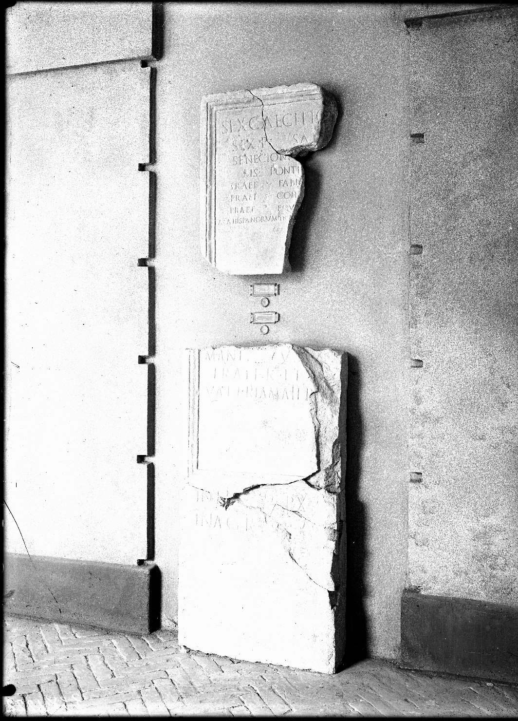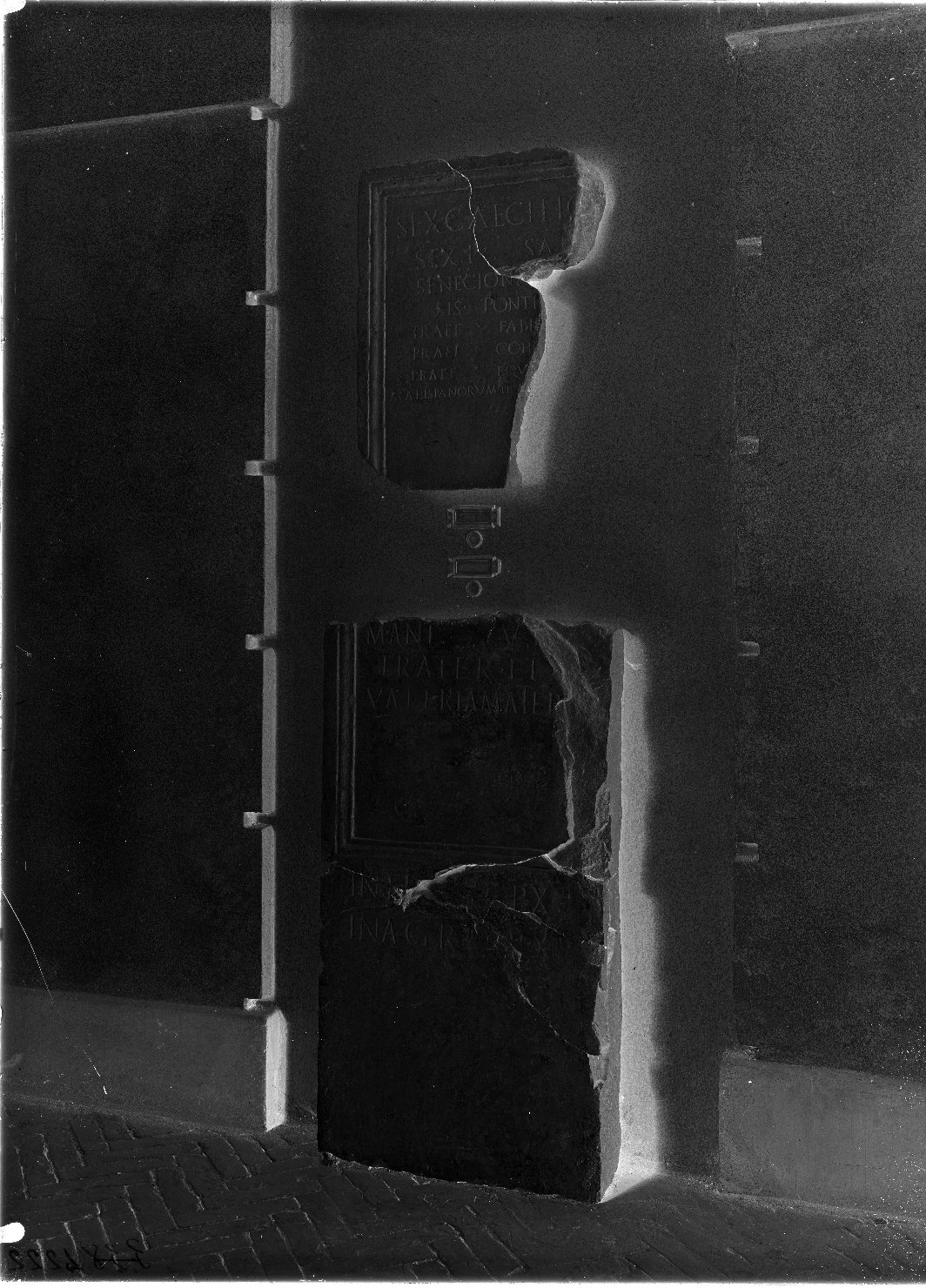 - NOTIZIE STORICO CRITICHE La lastra ritrae due epigrafi conservate nella loggia sul cortile d'onore di Corte Vecchia nel Palazzo Ducale di Mantova: fu qui allestita nel 1927 la sezione delle collezioni municipali con la "Raccolta Lapidaria Romana" (cfr. Nino Giannantoni, Il Palazzo Ducale di Mantova, Roma, La Libreria della Stato, 1929, pp. 65-66). I rilievi sono conservati presso il Museo del Palazzo Ducale di Mantova dal 1913, dopo la cessione da parte del Comune delle collezioni prima collocate presso il Palazzo degli Studi; tale raccolta è costituita dai pezzi della collezione gonzaghesca, insieme ad altre collezioni patrizie mantovane, riuniti negli anni 1773-1775 su iniziativa dell'abate Gian Girolamo Carli, segretario della Reale Accademia di Scienze e Belle Lettere (attuale Accademia Nazionale Virgiliana) e fu inizialmente allestita presso il Palazzo degli Studi. Per la storia delle collezioni si veda Alda Levi, Sculture greche e romane del Palazzo Ducale di Mantova, Roma, Biblioteca d'arte editrice, 1931, pp. 3-12 e soprattutto Alda Levi, Il Museo greco-romano nel Palazzo Ducale di Mantova, "Bollettino d'Arte", novembre 1925, pp. 225-234. Lo scatto è stato eseguito nella loggia dove tutt'oggi i rilievi sono collocati, e risale probabilmente al momento dell'allestimento. Per la lapide in alto in particolare si veda Giovanni Labus, Il museo della R. Accademia di Mantova, I, Mantova, D'Arco e Negretti, 1837, pp. 55-60:55, e tav. XVI: lapide "già posseduta da Marcello Donati, illustre medico mantovano del secolo XVI, poi conservataci dal marchese Silvio Gonzaga". Per la lapide in basso si veda ivi, II, pp. 308-314:313-314, Epigrafi antiche, tav. LII