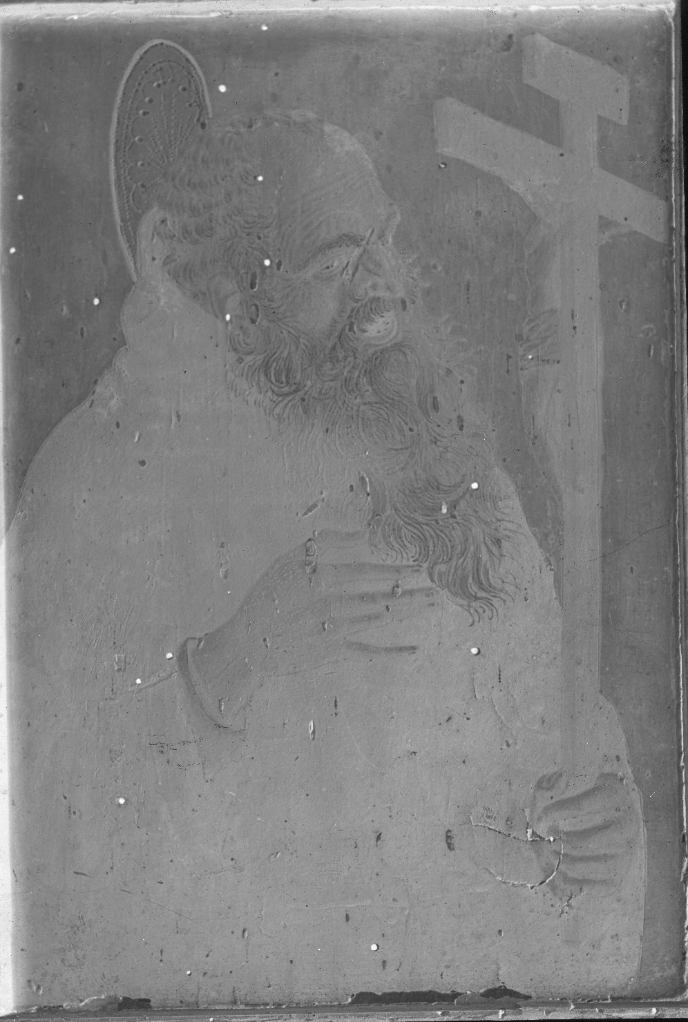 • NOTIZIE STORICO CRITICHE La lastra riproduce una tempera su tavola rappresentante San Benedetto da Norcia, giunta in Palazzo Ducale in coppia con un'altra tavola rappresentante Santa Scolastica nel 1915, dal Palazzo Accademico. In quell'anno le opere conservate presso l'Accademia mantovana furono infatti depositate presso il Palazzo Ducale in seguito ad un accordo fra il Comune e lo Stato secondo il quale, pur restando immutata la proprietà, gli oggetti del Comune e dell'Accademia sarebbero stati conservati nel più prestigioso e sicuro, in contesto belllico, edificio della città. Si può supporre che lo scatto sia stato eseguito dopo l'arrivo dell'opera presso il Palazzo Ducale. L'opera, insieme alla tavola gemella, è dal 2004 conservata presso il Museo della Città, Palazzo san Sebastiano. Per la storia delle collezioni e dei loro spostamenti si veda Stefano L'Occaso, Museo di Palazzo Ducale di Mantova. Catalogo generale delle collezioni inventariate. Dipinti fino al XIX secolo, Mantova, Publi Paolini, 2011, pp. 3-53, e in part. pp. 30-33. Ozzola (Leandro Ozzola, La Galleria di Mantova. Palazzo Ducale, Mantova, a cura dell'Ente Provinciale per il Turismo, 1953, p. 6, n. cat. 27 e fig. 30) e Carlo Bertelli (Mantova. Il Museo della Città, a cura di Stefano Benetti, Gian Maria Erbesato, chiara Pisani, Milano, Skira, 2005, p. 119) attribuiscono la tavola riprodotta a Bernardo da Parenzo (Parentino), mentre L'Occaso (op. cit. pp. 109-110, n. cat. 54, tav. XVIII) la assegna ad Artista padovano-ferrarese