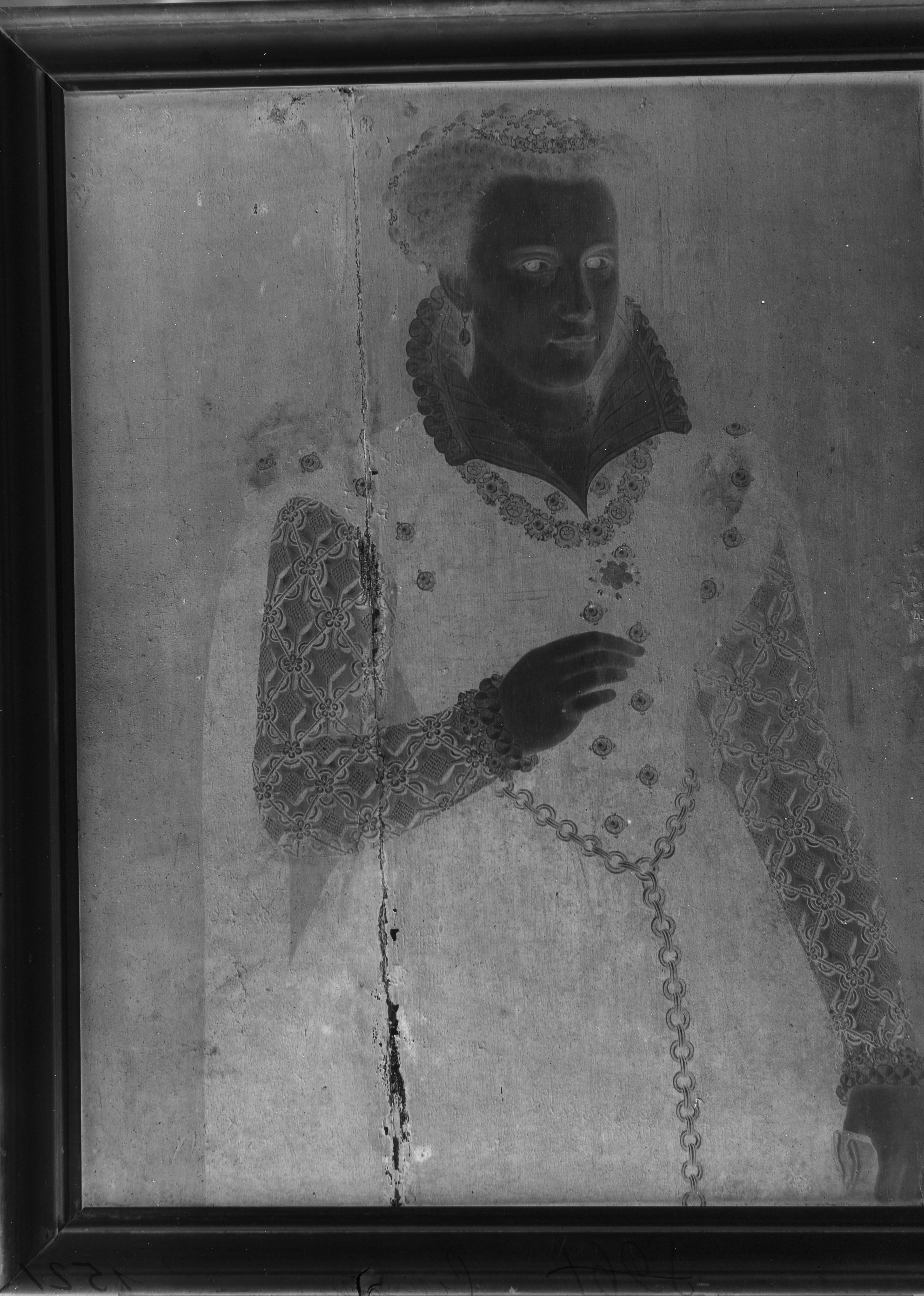- NOTIZIE STORICO CRITICHE La lastra ritrae la pittura su tavola, copia da Anthonis Mor, con ritratto di una dama ignota, dubitativamente identificata con Louise de Lorraine. L'opera, esposta nella Sala dei Falconi di Palazzo Ducale (Corte Vecchia) era conservata presso Sant'Orsola in Mantova fino al 1786 e venne poi trasferita presso il Regio Ginnasio prima e presso il Palazzo Accademico prima del 1810 e fino al 1915-1923, quando fu infine trasferita nel Palazzo Ducale dove è tuttora conservata. La data dello scatto risale con tutta probabilità agli anni 1915-1923, quando l'opera fu acquisita dal Museo di Palazzo Ducale. Lo scatto è stato probabilmente eseguito dopo un restauro della tavola antecedente quello di Guido Gregorietti del 1954 (il primo restauro documentato); cfr. NCTN 03230652 dove è riprodotta la stessa tavola, priva dei distacchi del colore visibili in questo scatto e con una maggiore nitidezza. Cfr. Stefano L'Occaso, Museo di Palazzo Ducale di Mantova. Catalogo generale delle collezioni inventariate. Dipinti fino al XIX secolo, Mantova, Publi Paolini, 2011, pp. 207-208, n. cat. 218, tav. LXI. Vedi anche Leandro Ozzola, La Galleria di Mantova. Palazzo Ducale, a cura dell'Ente Provinciale per il Turismo, Mantova, 1953, n. cat. 116, p. 18 e fig. 85, dove l'opera è attribuita a Giovanni Bahuet