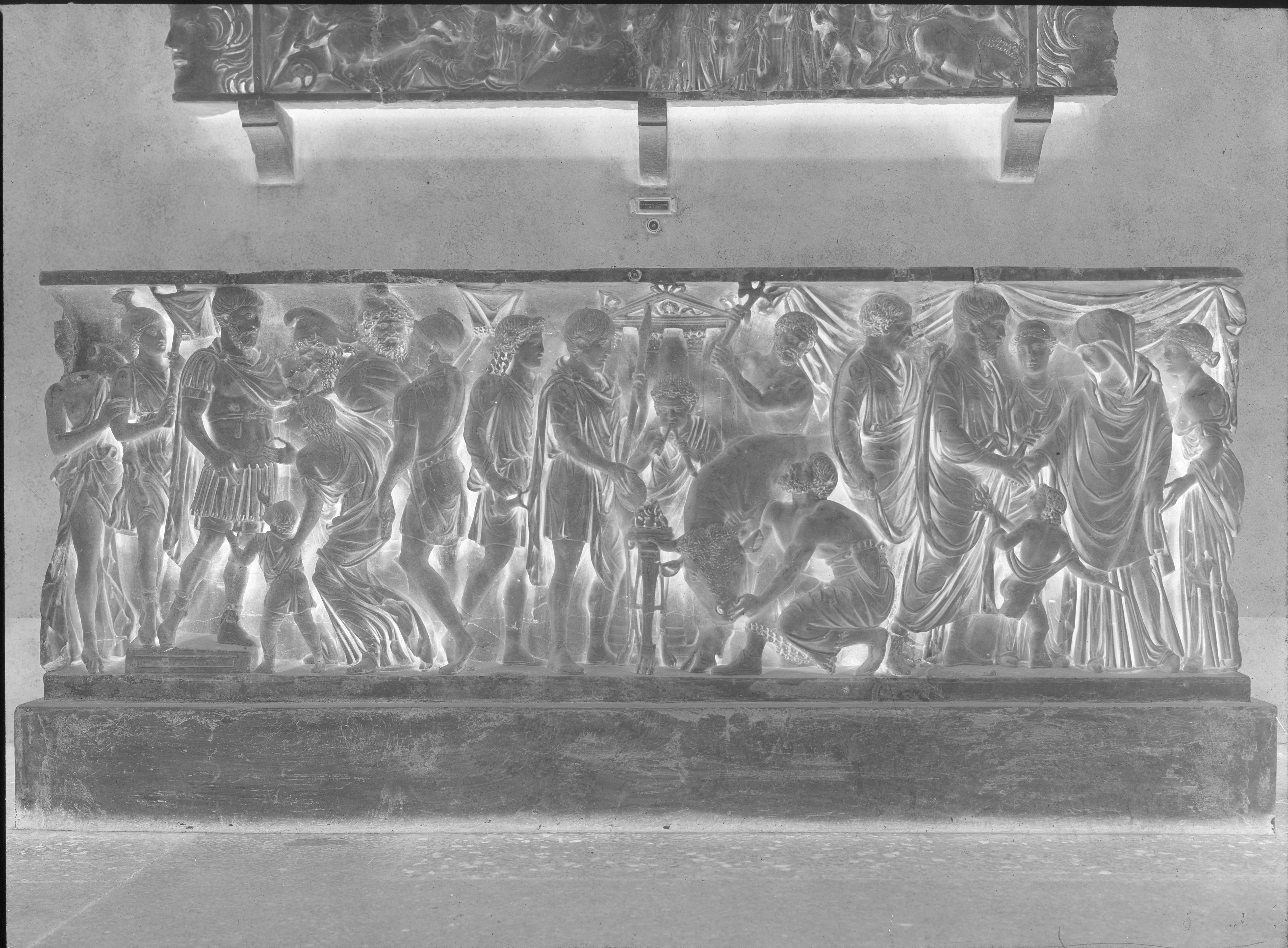 - NOTIZIE STORICO CRITICHE La lastra ritrae la fronte di sarcofago con scene di vita di un generale romano delle collezioni gonzaghesche, conservata presso il Museo di Palazzo Ducale. Lo scatto è stato probabilmente tratto in occasione dell'allestimento delle collezioni greco-romane promosso da Clinio Cottafavi e portato a termine da Alda Levi a partire dal 1925. I rilievi di sarcofagi vennero esposti nella Galleria Nuova: cfr. Alda Levi, Il museo greco-romano nel Palazzo Ducale di Mantova, "Bollettino d'Arte", novembre 1925, pp. 225-234. L'immagine è pubblicata in Alda Levi, Rilievi di sarcofagi del Palazzo Ducale di Mantova, "Dedalo", fasc. III, a. VII, settembre 1926, pp. 205-230, in part. pp. 222-229, fig. a p. 223 e in Alda Levi, Sculture greche e romane del Palazzo Ducale di Mantova, Roma, Biblioteca d'Arte editrice, 1931, pp. 86-88, n. 186, "Fronte di Sarcofago: scene di vita di un personaggio romano" e tav. XCV
