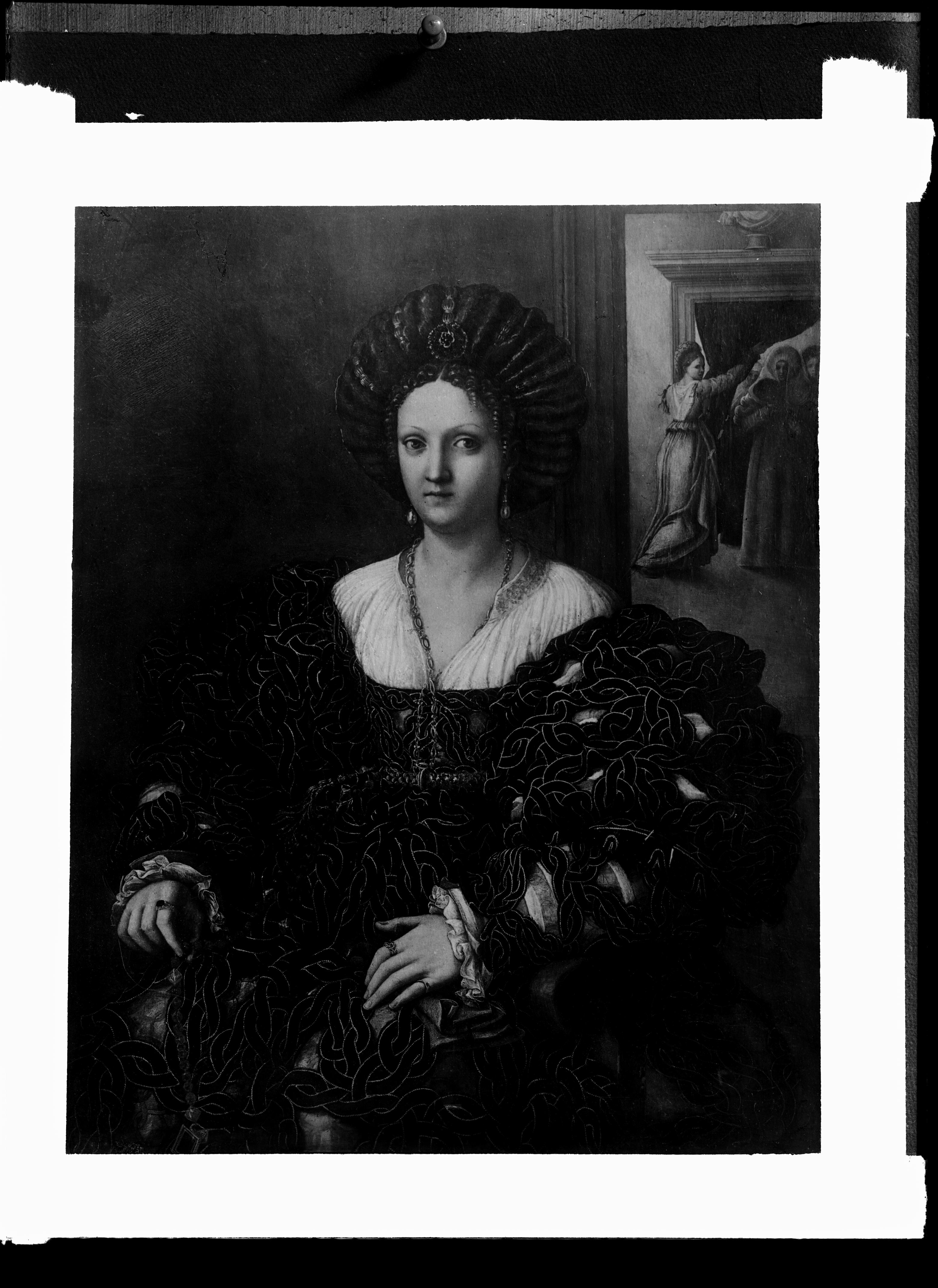 - NOTIZIE STORICO CRITICHE La lastra rappresenta il ritratto di Margherita Paleologo, moglie di Federico II Gonzaga, marchese e poi primo duca di Mantova. Il dipinto, conservato ad Hampton Court. Pur non essendo l'opera stata esposta nella Mostra iconografica gonzaghesca del 1937, è plausibile che l'immagine sia stata realizzata in questa occasione, quando tuttavia la dama raffigurata era identificata con la marchesa Isabella d'Este: cfr. Mostra iconografica gonzaghesca, Catalogo delle opere, Mantova, Palazzo Ducale, 16 maggio-19 settembre 1937, Mantova, Tip. L'Artistica, 1937. Per scheda del dipinto cfr. Splendours of the Gonzaga, Catalogo della mostra, a cura di D. Chambers e J. Martineau, Londra, 4 novembre 1981-31 gennaio 1982, Milano, Amilcare Pizzi, 1981, pp. 160-161, n. 110