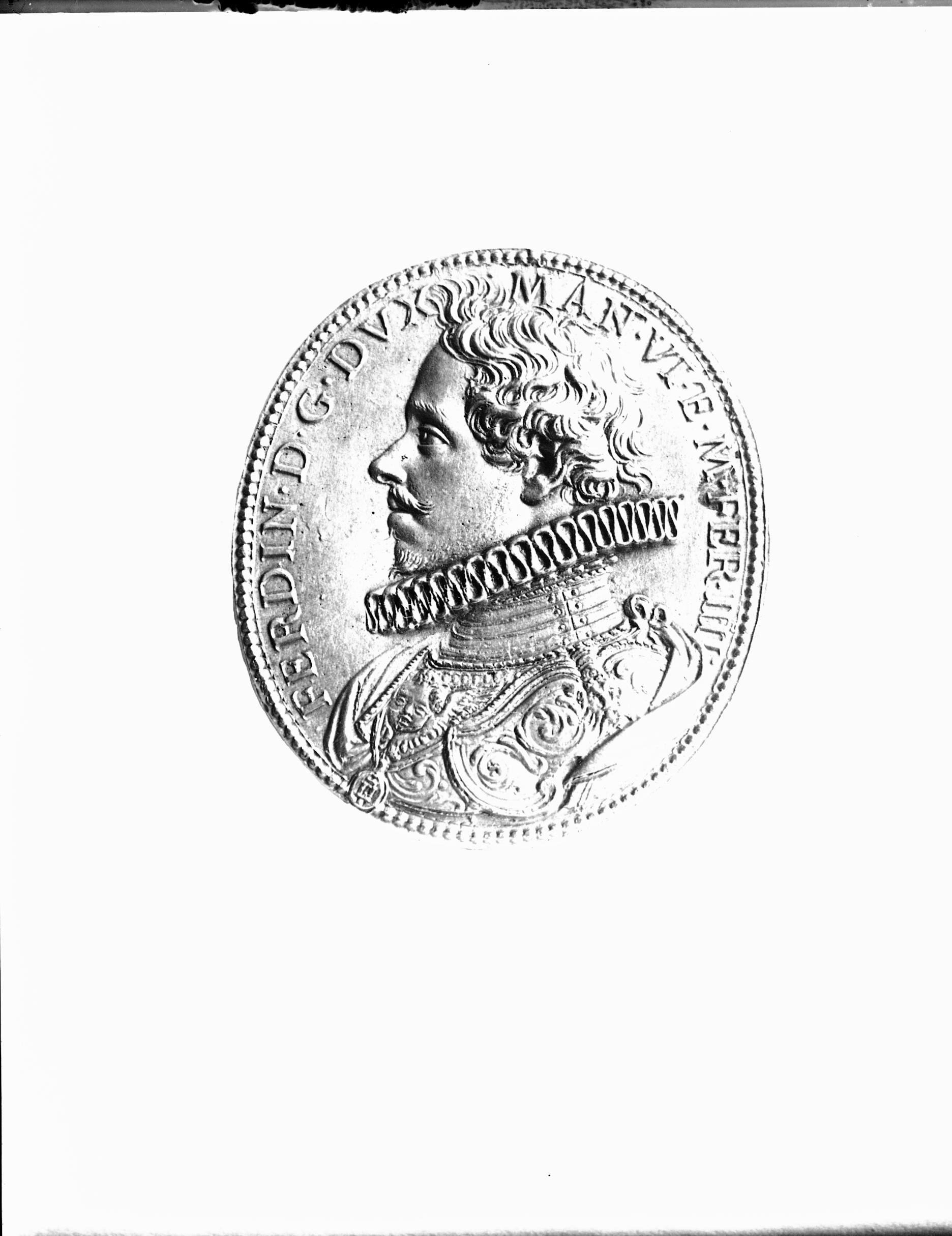 - NOTIZIE STORICO CRITICHE La lastra rappresenta la medaglia in bronzo con il profilo di Ferdinando Gonzaga, VI duca di Mantova. La medaglia fu esposta alla Mostra iconografica del 1937 con l'attribuzione a Gaspare Molo: cfr. Mostra iconografica gonzaghesca, Catalogo delle opere, Mantova, Palazzo Ducale, 16 maggio-19 settembre 1937, Mantova, Tip. L'Artistica, 1937, p. 43, n. 196. Pur non essendo pubblicata l'immagine, si può presumere che lo scatto sia stato realizzato in questa occasione. Si veda Monete e medaglie di Mantova e dei Gonzaga dal XII al XIX secolo. IV. I Gonzaga duchi di Mantova e marchesi poi duchi del Monferrato (1530-1627), Mantova, Banca Agricola Mantovana, 1997