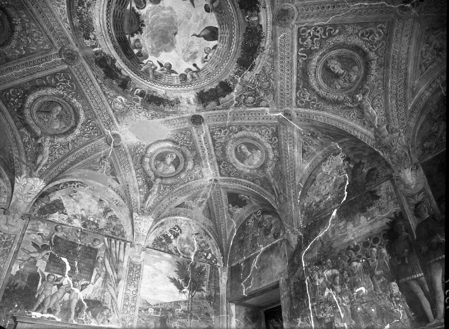 - NOTIZIE STORICO CRITICHE La lastra che documenta l'angolo Nord-Ovest della Camera Picta con un'inquadratura che arriva a comprendere quasi interamente l'oculo della volta e parte delle prime due campate delle pareti, è stata parzialmente pubblicata nel 1959 con la didascalia: "Idem [i.e. Restauro del 1938-41]: accecamento delle maggiori crepe fra la volta e le pareti" (La Camera degli Sposi del Mantegna a Mantova, testo di Luigi Coletti con un appendice di Ettore Camesasca, Milano, Rizzoli, 1959, p. 69, fig. 89). Il negativo documenta una fase intermedia del restauro eseguito dal bergamasco Mauro Pellicioli sull'opera di Mantegna e pertiene alla vasta campagna fotografica relativa realizzata in quell'occasione, i cui scatti preliminari datano già a partire dalla fine del 1932 (Ivi, pp. 66-73, figg. 82-92; Rodolfo Signorini, Opus hoc tenue: la camera dipinta di Andrea Mantegna, Parma, Artegrafica Silva, 1985, pp. 266-268). Coletti-Camesasca inseriscono ad illustrazione del loro studio la sola parte di lastra comprendente il lato settentrionale della stanza