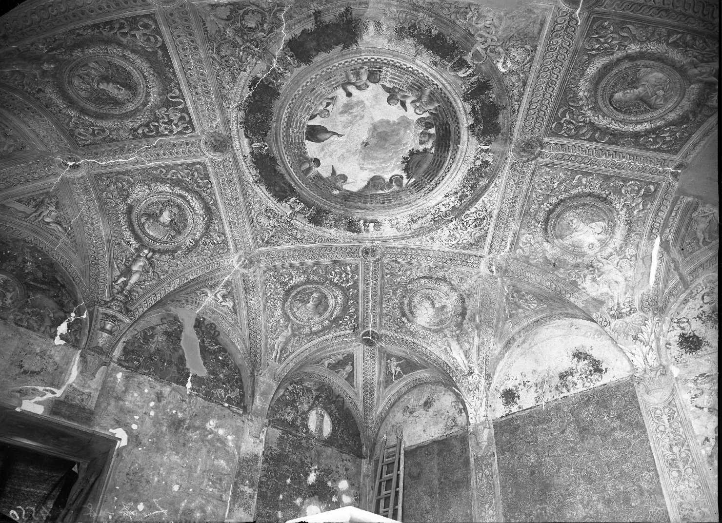 - NOTIZIE STORICO CRITICHE La lastra documenta l'angolo Sud-Est della Camera Picta con un'inquadratura che arriva a comprendere quasi interamente l'oculo della volta e parte delle prime due campate delle pareti con le cortine abbassate dipinte. Lo scatto è stato effettuato nel corso di un intervento di restauro, evidente dal contrasto fra superfici dipinte e stuccature ancora bianchissime. Pare lecito ipotizzare che il negativo faccia parte della vasta campagna fotografica relativa agli interventi eseguiti sulle pareti della sala dal bergamasco Mauro Pellicioli tra 1938 e 1941, gli scatti preliminari della quale furono realizzati già a partire dalla fine del 1932 (La Camera degli Sposi del Mantegna a Mantova, testo di Luigi Coletti con un appendice di Ettore Camesasca, Milano, Rizzoli, 1959, pp. 66-73, figg. 82-92; Rodolfo Signorini, Opus hoc tenue: la camera dipinta di Andrea Mantegna, Parma, Artegrafica Silva, 1985, pp. 266-268). Il negativo mostra una fase intermedia del restauro, dopo la rimozione delle ridipinture dovute a precedenti operazioni manutentive e dopo l'avvenuta tamponatura delle lacune, qui ancora evidenziate dal bianco di calce. Il dato è confermato dall'"Inventario 1920-1977" che in corrispondenza della nostra lastra riporta la didascalia: "Sala Sposi - a metà restauro". Lo scatto fa parte di un gruppo di quattro lastre (invv. 4548-4551) che presentano la medesima inquadratura angolare fra volta e pareti e che mostrano tutte la sala allo stesso stadio di avanzamento dei lavori di restauro