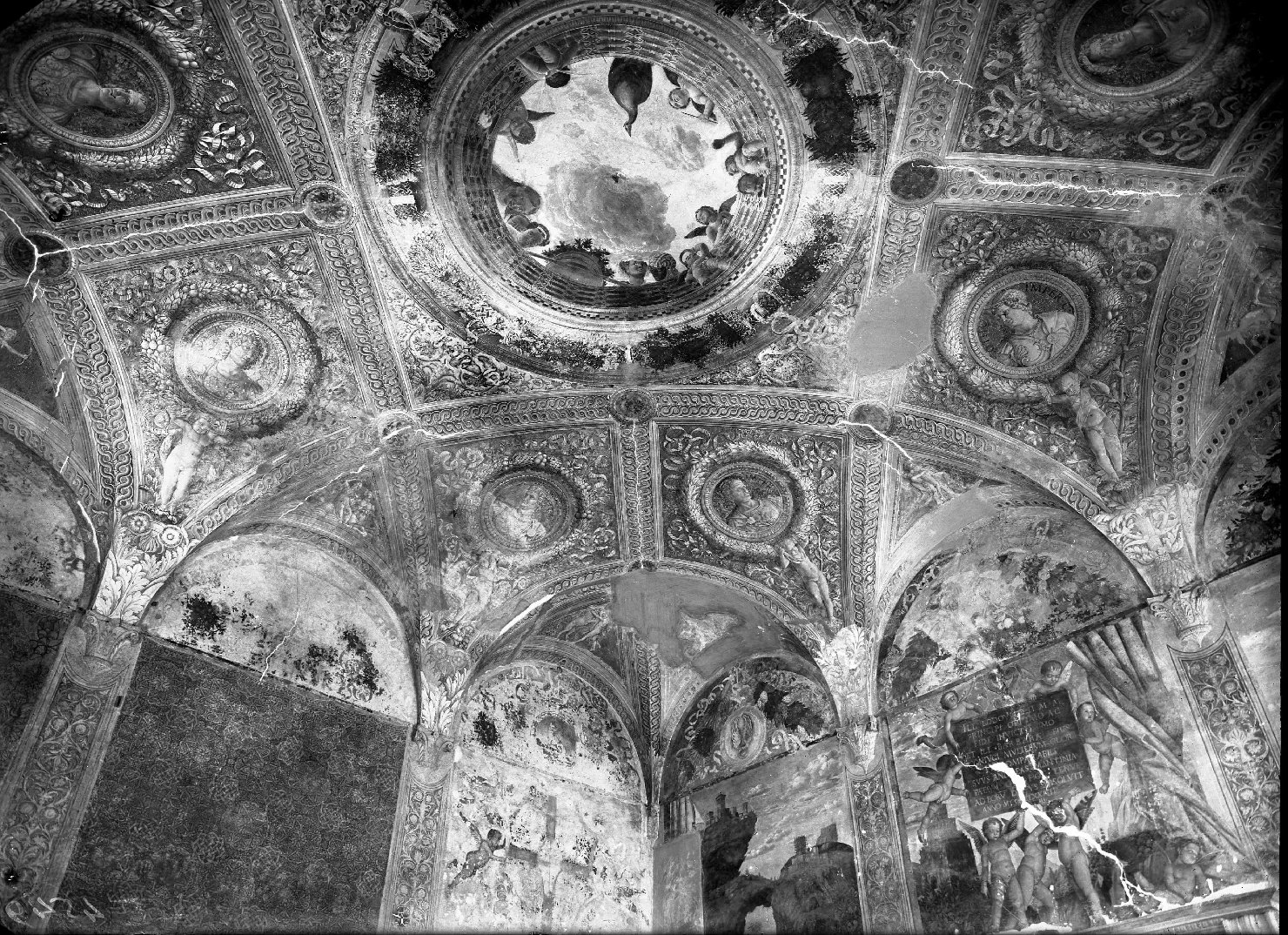 - NOTIZIE STORICO CRITICHE La lastra documenta l'angolo Sud-Ovest della Camera Picta con un'inquadratura che arriva a comprendere quasi interamente l'oculo della volta e parte delle prime due campate delle pareti. Lo scatto è stato effettuato nel corso di un intervento di restauro, evidente dal contrasto fra superfici dipinte e stuccature ancora bianchissime. Pare lecito ipotizzare che il negativo faccia parte della vasta campagna fotografica relativa agli interventi eseguiti sulle pareti della sala dal bergamasco Mauro Pellicioli tra 1938 e 1941, gli scatti preliminari della quale furono realizzati già a partire dalla fine del 1932 (La Camera degli Sposi del Mantegna a Mantova, testo di Luigi Coletti con un appendice di Ettore Camesasca, Milano, Rizzoli, 1959, pp. 66-73, figg. 82-92; Rodolfo Signorini, Opus hoc tenue: la camera dipinta di Andrea Mantegna, Parma, Artegrafica Silva, 1985, pp. 266-268). Il negativo mostra una fase intermedia del restauro, dopo la rimozione delle ridipinture dovute a precedenti operazioni manutentive e dopo l'avvenuta tamponatura delle lacune, qui ancora evidenziate dal bianco di calce. Il dato è confermato dall'"Inventario 1920-1977" che in corrispondenza della nostra lastra riporta la didascalia: "Sala Sposi - a metà restauro". Lo scatto fa parte di un gruppo di quattro lastre (invv. 4548-4551) che presentano la medesima inquadratura angolare fra volta e pareti e che mostrano tutte la sala allo stesso stadio di avanzamento dei lavori di restauro