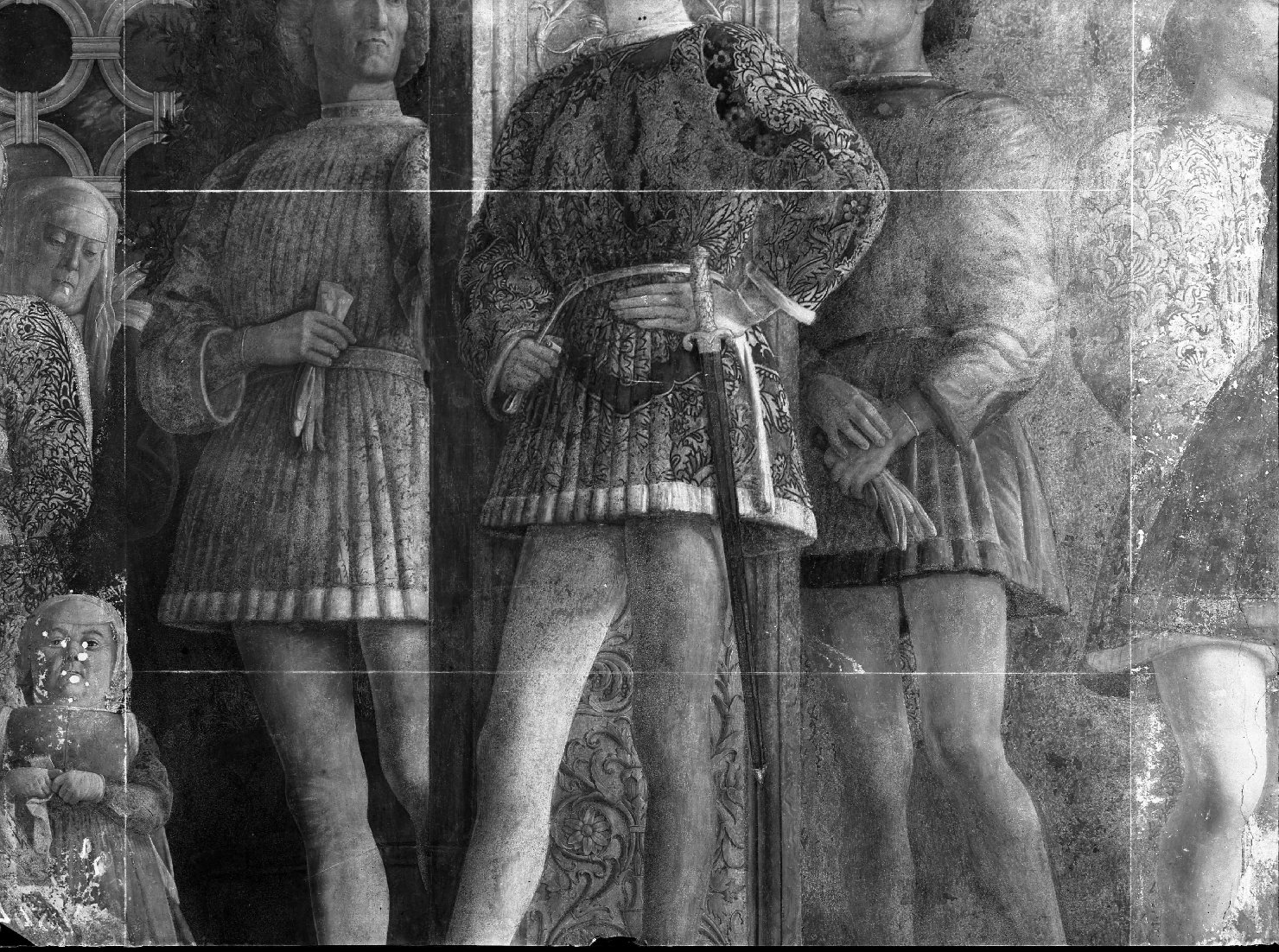 - NOTIZIE STORICO CRITICHE La lastra documenta l'aspetto di una porzione della parete settentrionale della Camera degli Sposi, e ha come asse visivo il pilastro dipinto di destra nella campata centrale della parete. La bibliografia ci permette di ipotizzare che lo scatto faccia parte della vasta campagna fotografica relativa al restauro eseguito sulle pareti della Camera Picta da Mauro Pellicioli tra 1938 e 1941, le prime foto della quale furono presumibilmente realizzate già a partire dalla fine del 1932 (La Camera degli Sposi del Mantegna a Mantova, testo di Luigi Coletti con un appendice di Ettore Camesasca, Milano, Rizzoli, 1959, pp. 66-71, figg. 82-92; Rodolfo Signorini, Opus hoc tenue: la camera dipinta di Andrea Mantegna, Parma, Artegrafica Silva, 1985, pp. 266-268). L'"Inventario 1920-1977" riporta, in corrispondenza del nostro negativo (Custodia 38), la didascalia "Sala Sposi - D. il R. [dopo il restauro]". Si tratta di una delle rare testimonianze fotografiche riferite alla conclusione dell'intervento, anche se la presenza delle riquadrature a gesso ancora in sede attesta che i lavori sono ancora in corso d'opera. Il negativo si ricollega a quelli numerati 4545 e 4546 (NCTN 03230862 e 03230861), che documentano, sempre nella fase finale delle operazioni di restauro, le porzioni superiore e inferiore della parete, mantenendo al centro dell'immagine lo stesso pilastro dipinto. La lastra 4535 (NCTN 00727299) mostra invece il medesimo soggetto nella fase iniziale dell'intervento di Pellicioli