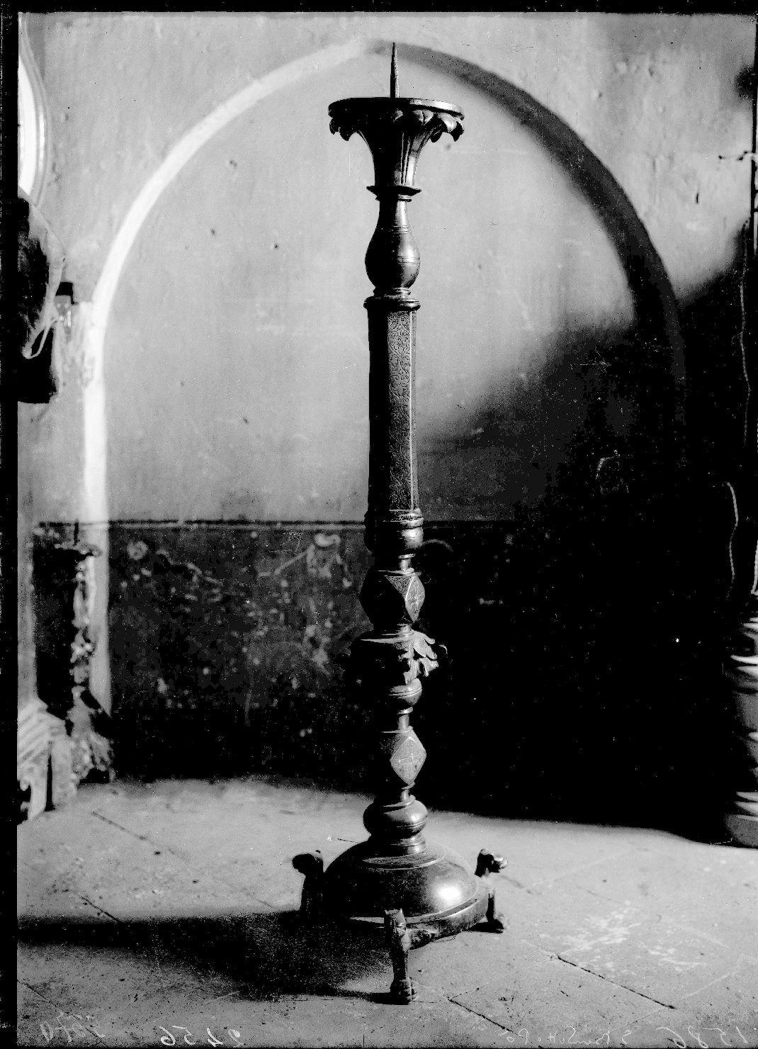 - NOTIZIE STORICO CRITICHE L'inventario manoscritto alla pagina intestata S. Benedetto Po, riporta varie campagne fotografiche di documentazione della Parrocchiale, datate 1940 e 1941. La lastra in esame (1941) raffigura un candelabro risalente al XII secolo, alla fase cluniacense dell'abbazia. La parte superiore è un'aggiunta cinquecentesca mentre il resto è perfettamente conservato. La lastra ha subito un trattamento con sali di mercurio (colorazione gialla del supporto) e presenta un consistente ritocco a grafite in corrispondenza dell'oggetto