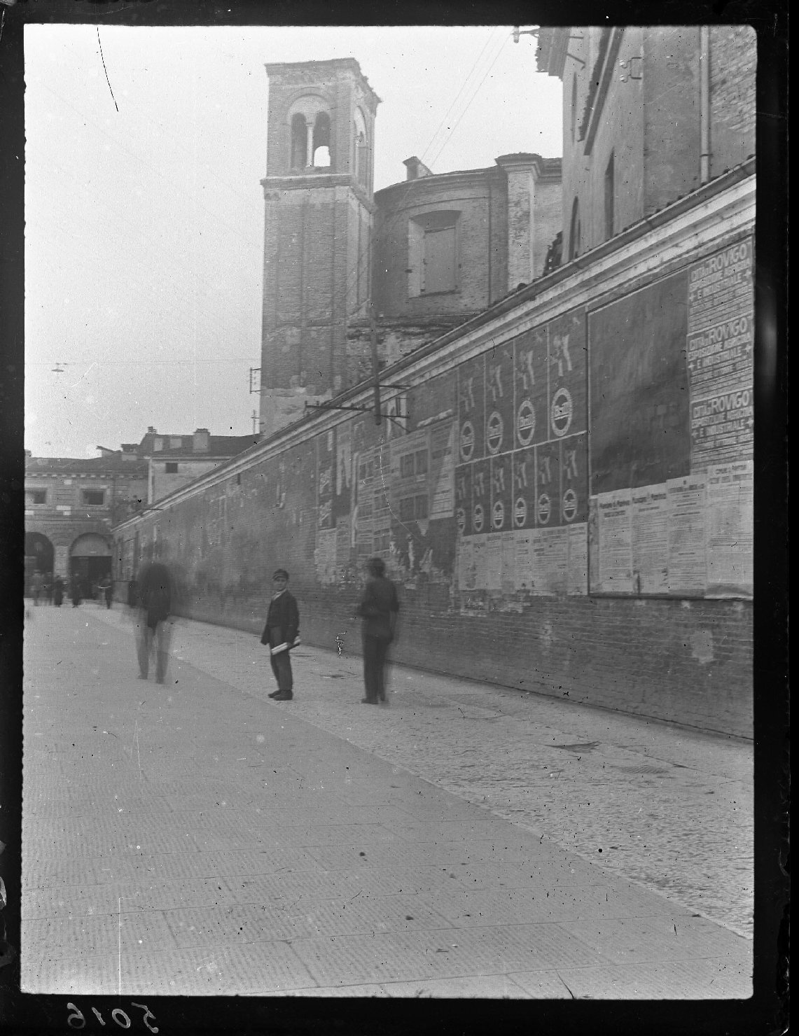- NOTIZIE STORICO CRITICHE Per esigenze di riassetto urbanistico, ricavando una nuova arteria viabile tra Piazza Garibaldi e Via XX Settembre, attorno al 1925 vennero completamente demoliti chiesa e convento di San Domenico. Dell'intero complesso rimase solo il campanile. Presso l'Archivio della Soprintendenza Architettonica bresciana è conservata una lettera di richiesta, da parte della Soprintendenza di Verona allora competente per area territoriale, indirizzata a Guglielmo Pacchioni, Regio Ispettore ai Monumenti a Palazzo Ducale dal 1912 al 1923. Si richiedono immagini che mostrino lo stato dell'abside e del campanile di S. Domenico, con preghiera di utilizzare il formato 18x24 e di trasmettere la nota spese. Lo scatto in esame riprende la parte posteriore del complesso, parzialmente coperta dal muro di cinta, con l'abside e la torre campanaria. Un manifesto relativo all'Esposizione Agricola Industriale di Rovigo del 1920 è affisso sul muro esterno. La ripresa è da confrontarsi con scheda NCTN 3253072. L'arco cronologico corrisponde alla richiesta fatta dalla Soprintendenza veronese, prima di intraprendere i lavori di demolizione e di riqualificazione urbanistica dell'intera area anche se il formato è differente rispetto a quello indicato. Il bordo scuro intorno all'immagine suggerisce una riproduzione da positivo