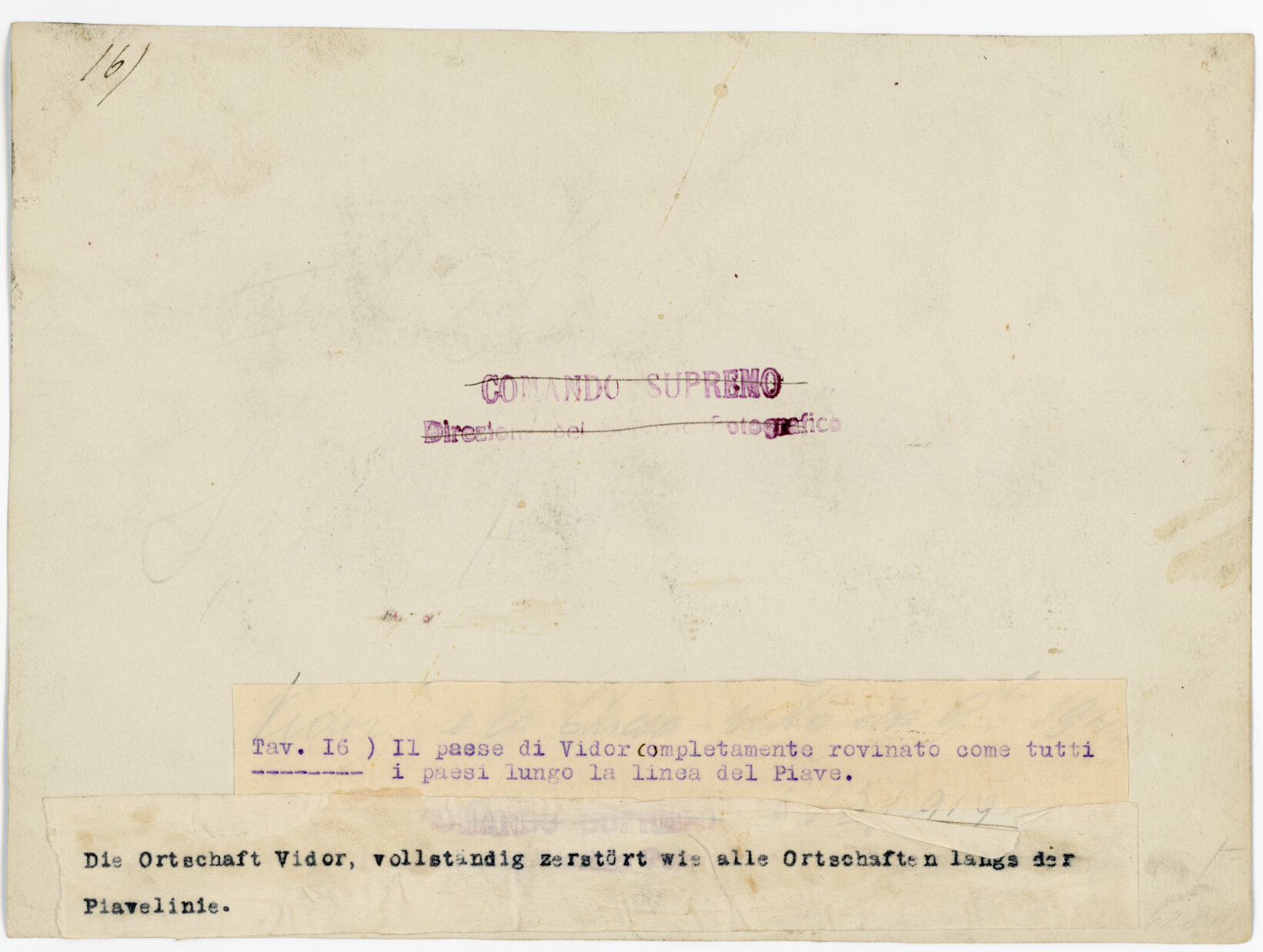 - NOTIZIE STORICO CRITICHE L'immagine documenta l'abitato di Vidor presso la chiesa arcipretale in una ripresa probabilmente effettuata dalla salita del colle del castello. Il villaggio, ubicato sulle rive del Piave in un punto strategicamente determinante per le sorti del conflitto, fu distrutto nel corso della Prima guerra mondiale (il paese occupato dalle truppe austro-ungariche dopo la battaglia Caporetto dell’ottobre del ’17). La cronologia di stampa è circoscritta in maniera approssimativa entro il 1920. Si segnala che sotto le etichette incollate al verso del fototipo traspare la data del marzo 1919, probabilmente relativa alla cronologia di ripresa dell'immagine, eseguita probabilmente al termine del conflitto. Nei territori dichiarati zona di guerra vigeva il divieto di eseguire riprese fotografiche: molte immagini come la presente sono attribuibili agli addetti militari del Laboratorio fotografico del Comando Supremo