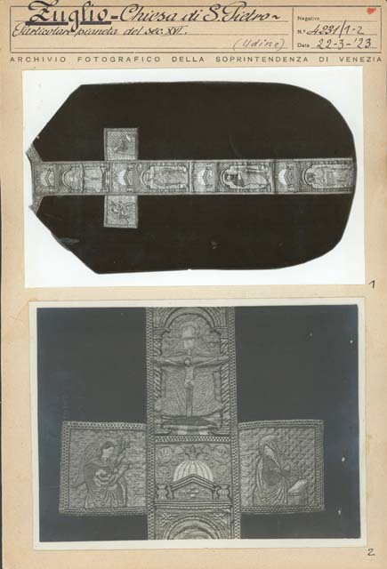 - ISCRIZIONI sul supporto secondario: in alto - Zuglio - Chiesa di S. Pietro/Particolare pianeta del sec. XVI/ (Udine)/ ARCHIVIO FOTOGRAFICO DELLA SOPRINTENDENZA DI VENEZIA/ Negativo/ N° 4231/ Data 22-3-'23 - Archivio Fotografico Soprintendenza ai Monumenti di Venezia - a penna/ a stampa - italiano