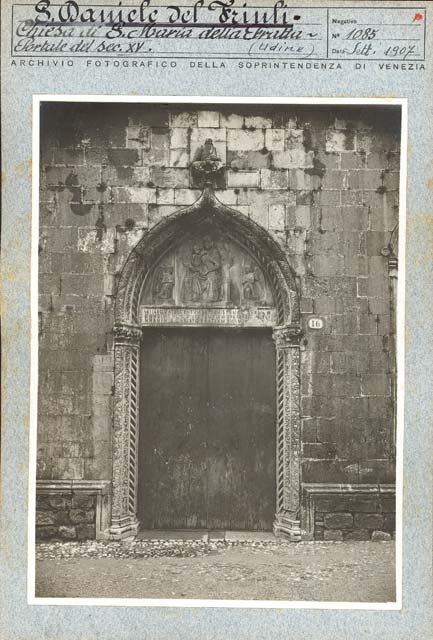 - ISCRIZIONI sul supporto secondario: in alto - S. Daniele del Friuli -/ Chiesa S. Maria della Fratta -/ Portale del sec. XV/ ARCHIVIO FOTOGRAFICO DELLA SOPRINTENDENZA DI VENEZIA/ Negativo/ N° 1085/ Data Sett. 1907 - Archivio Fotografico Soprintendenza ai Monumenti di Venezia - a penna/ a stampa - italiano