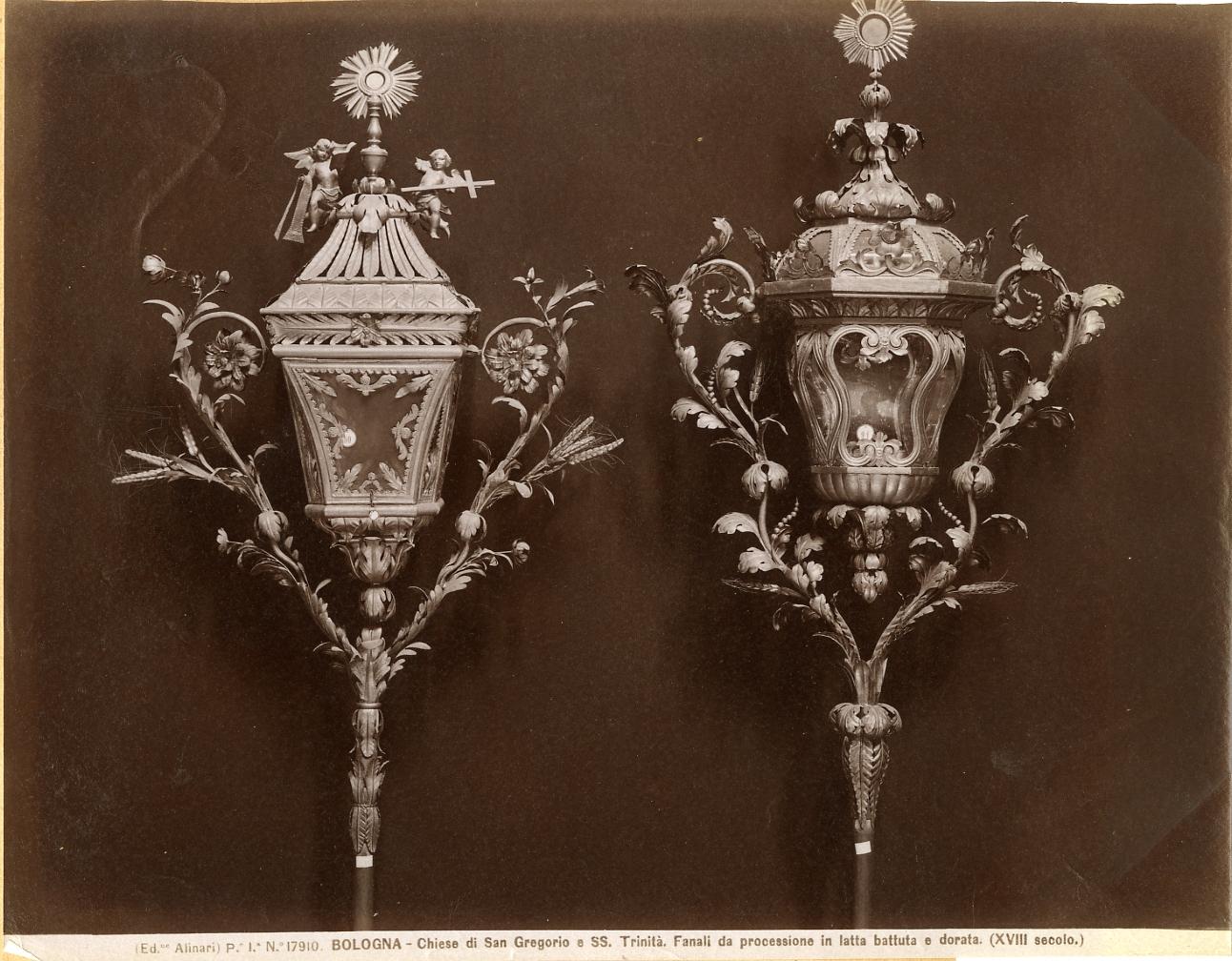 - ISCRIZIONI sul supporto primario: recto: in basso al centro - (Ed.ne Alinari) P.e I.a N°.17910. BOLOGNA - Chiesa di San Gregorio e SS. Trinità. Fanali da processione in latta battuta e dorata. (XVIII secolo) - fotografica -