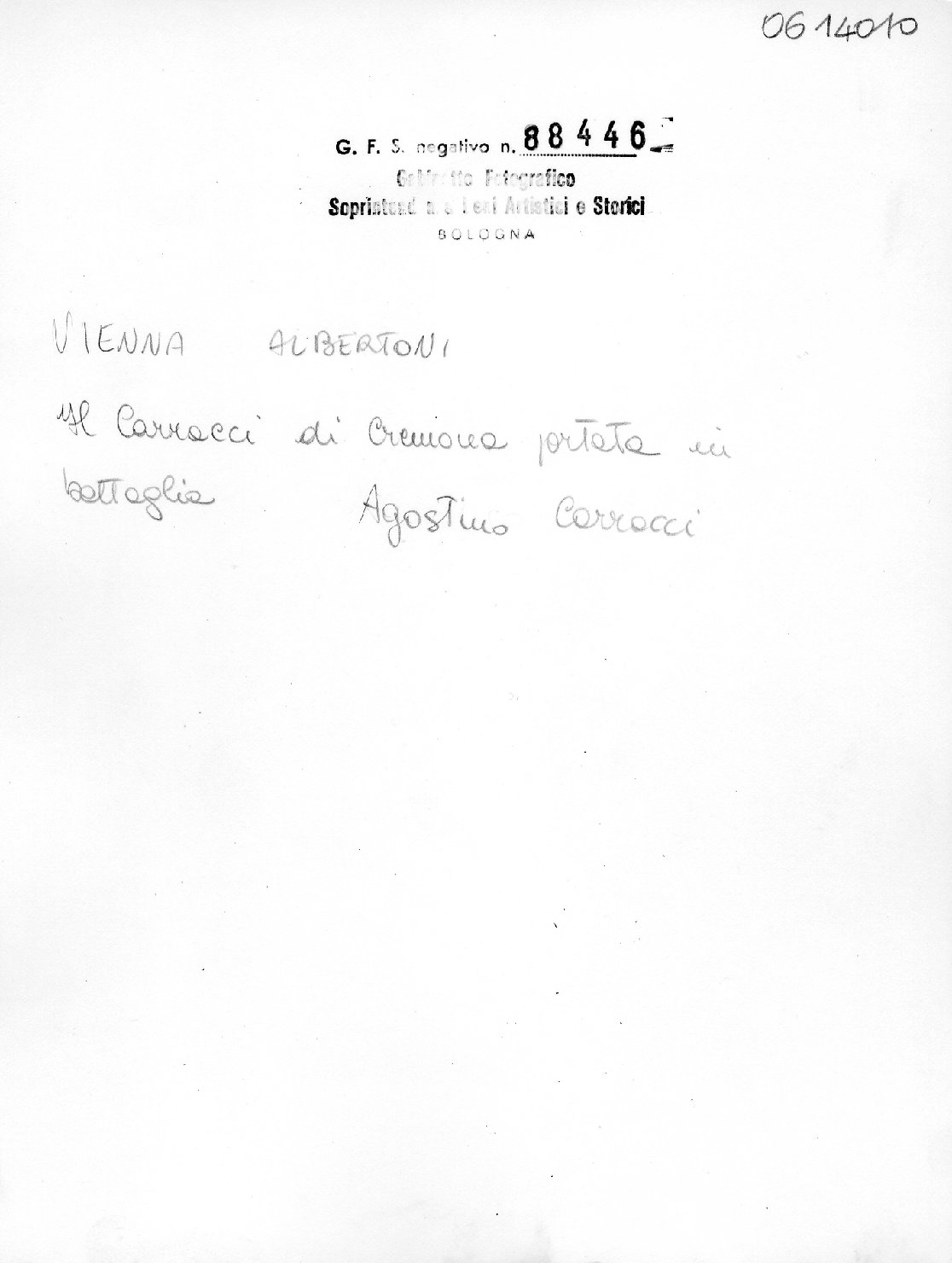 - ISCRIZIONI sul supporto primario: verso: in alto a sinistra - VIENNA ALBERTONI/ Il Carrocci di Cremona portata in/ battaglia Agostino Carracci - a matita -