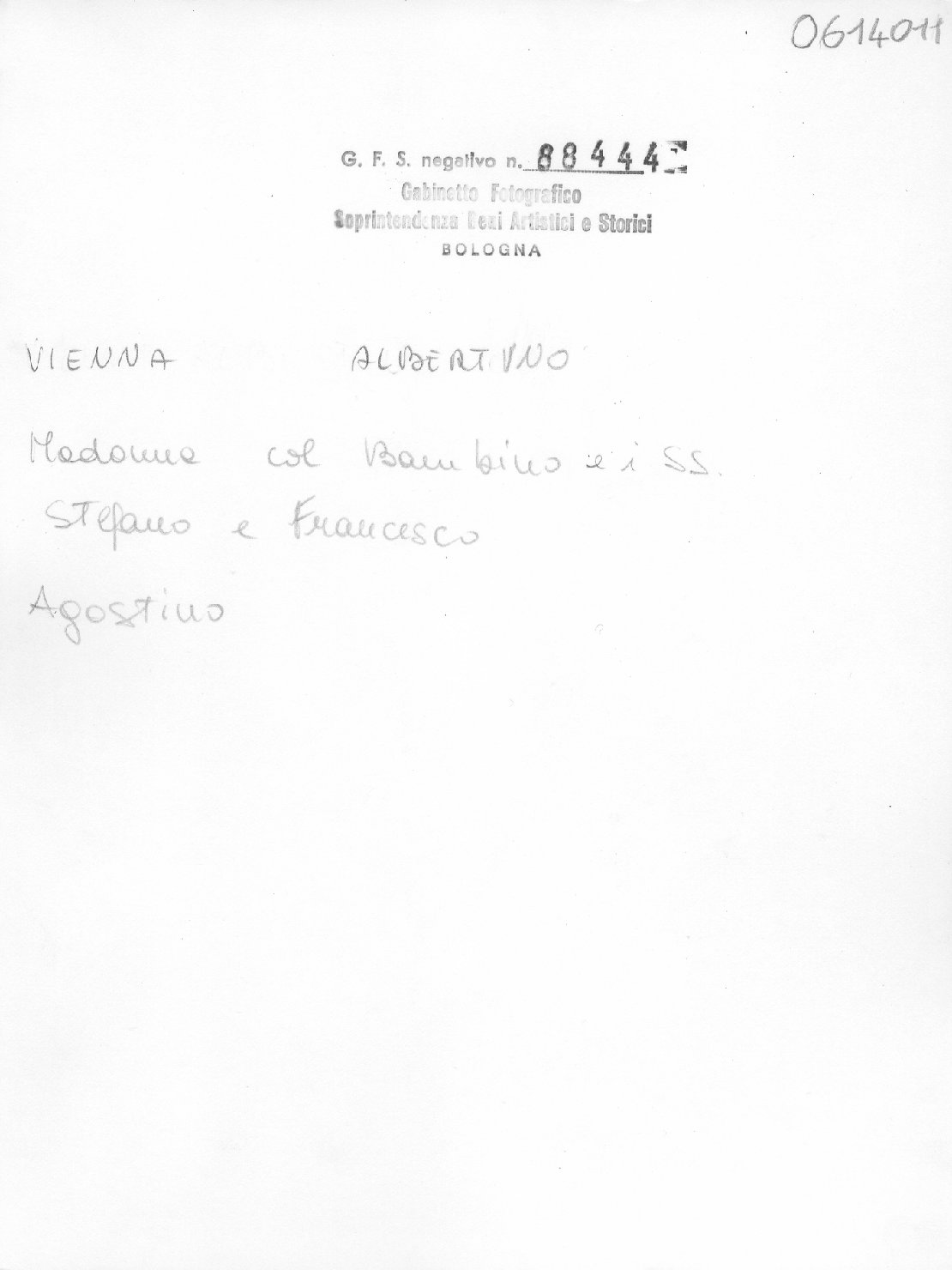 - ISCRIZIONI sul supporto primario: verso: in alto a sinistra - VIENNA ALBERTINO/ Madonna col Bambino e i SS./ Stefano e Francesco/ Agostino - a matita -
