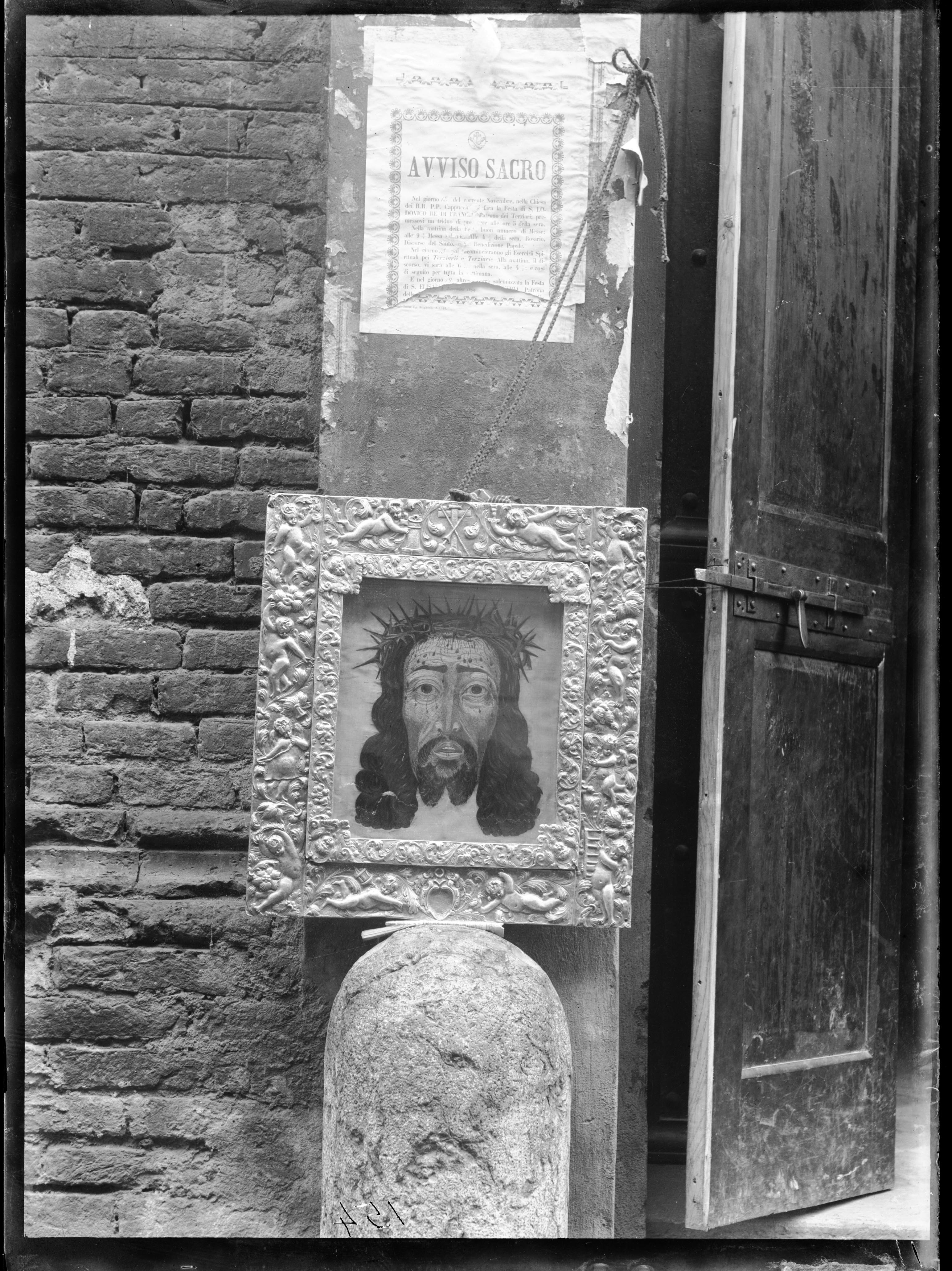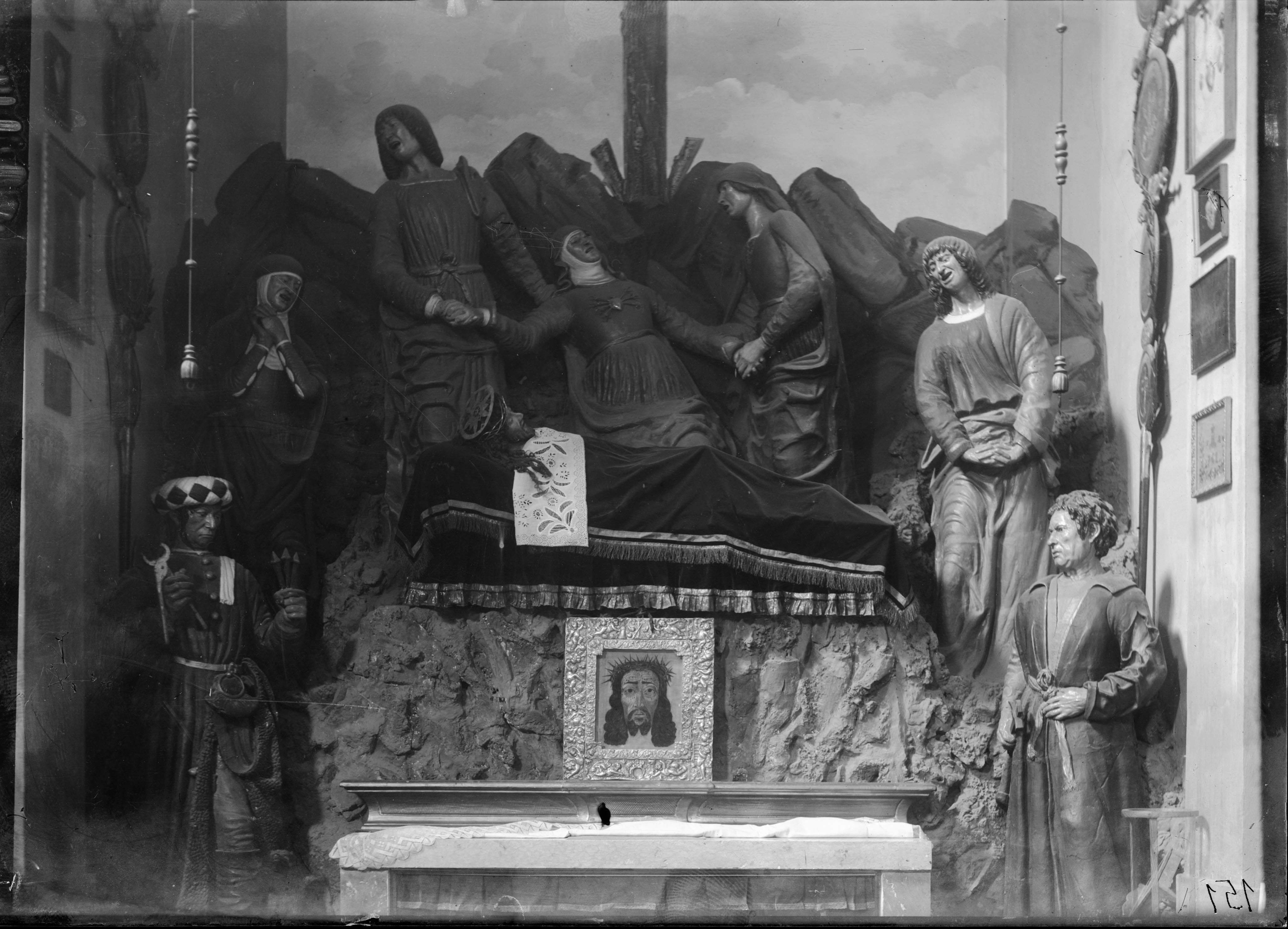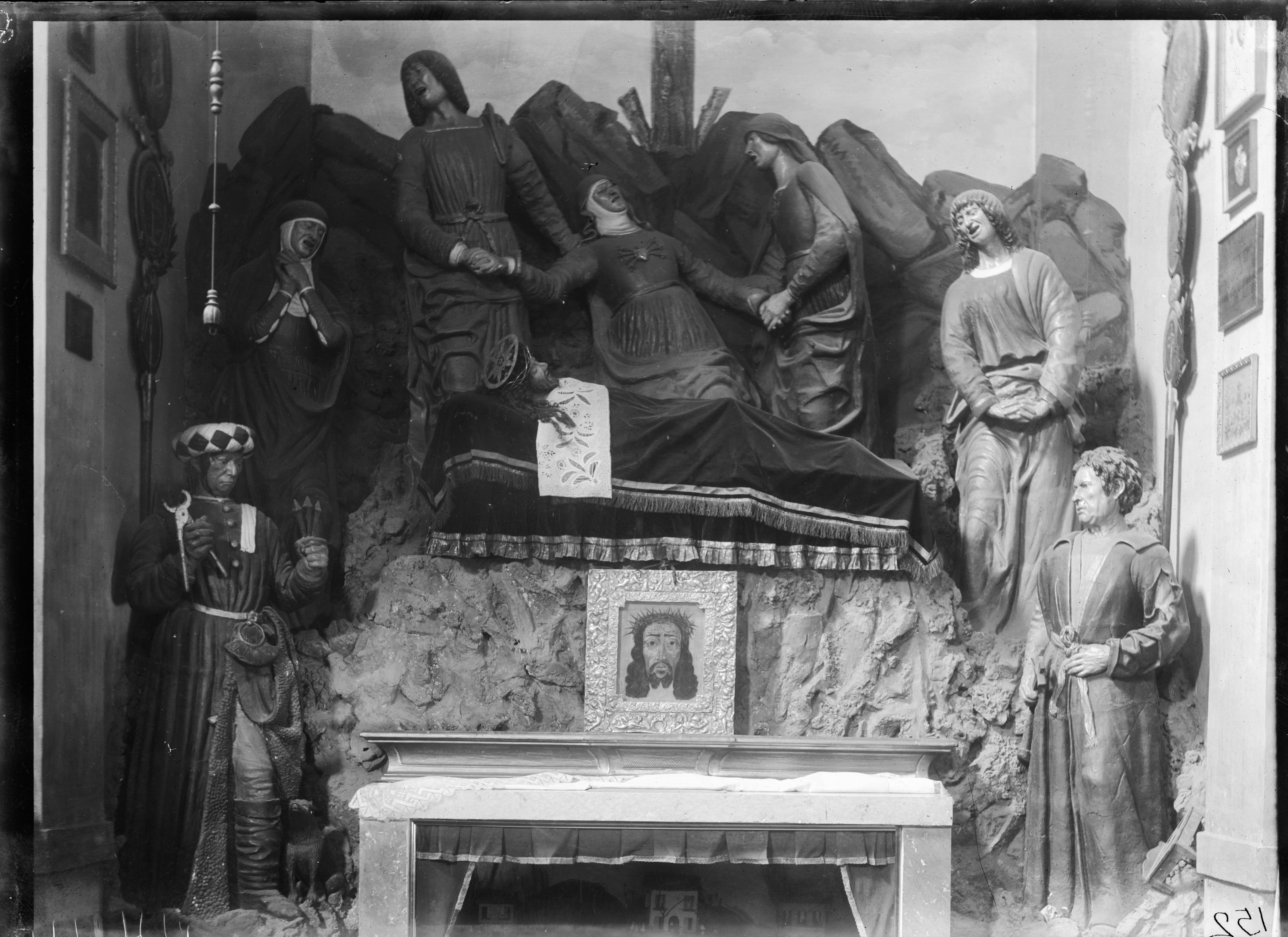 - NOTIZIE STORICO CRITICHE I primi cenni sulla chiesa di San Giovanni Evangelista risalgono al XII secolo, anche se della struttura originaria non è rimasto nulla. Fu ricostruita nel 1545 e, nel secolo successivo, affrescata dagli artisti che saranno poi impegnati nel cantiere della Basilica della Ghiara. Nel 1808 fu confiscata dal governo napoleonico e venduta all'asta al mercante Luigi Trivelli, proprietario del palazzo antistante la chiesa. Il figlio Giacomo adibì la chiesa a concimaia e le cappelle laterali a botteghe. L'erede conte Ferrante Palazzi Trivelli, nel 1896, cedette in uso perpetuo la chiesa alla Venerabile Confraternita dell'Immacolata Concezione e di San Francesco d'Assisi, la più antica ed esistente confraternita di Reggio Emilia, fondata nella seconda metà del XIII secolo. Il Compianto reggiano era originariamente nella cappella del Sepolcro della chiesa di San Francesco e apparteneva alla Compagnia dei Battuti, costituitasi nel 1321. A Reggio i confratelli erano noti per essere veri e propri registi delle cerimonie del Venerdì Santo, forse proprio a partire dalla data di fondazione della cappella contenente il Compianto (1480). Nel 1808 la Confraternita viene dispersa e il Compianto passa alla chiesa di San Giorgio pervenendo nel 1896 nella attuale sede in S. Giovanni Evangelista. È probabile che, durante i vari trasferimenti, alcune statue si siano rotte irrimediabilmente e così siano state in qualche modo rimpiazzate con altre provenienti da altri mortori affini. Il gruppo è costituito da sette statue poste attorno al Cristo morto, ma il tutto è anomalo: manca, infatti, la statua della Maddalena, mentre l’evangelista Giovanni vi compare due volte. Il Cristo morto non è coerente con l’insieme essendo stata la scultura acquistata sul mercato antiquario negli anni ’50 del Novecento. L’opera è stata recentemente ascritta a Michele di Nicolò di Dino detto “Michele da Firenze” (1403-1457 ca.), girovago plasticatore formatosi nella bottega del Ghiberti a fianco di Donatello, autore tra 1440 e 1441 dell’altare delle statuine per il Duomo di Modena. Il Compianto di Reggio Emilia secondo ultimi studi, è il risultato dell’assemblaggio di gruppi diversi commissionati dall’antica confraternita reggiana che ancora oggi ne è la proprietaria. Le pesanti reintegrazioni e la grossolana ridipintura, già negativamente evidenziata da Adolfo Venturi agli inizi del Novecento, ne rendono infatti complessa una corretta lettura. Analoga peregrinazione toccò all’immagine del Santo Volto, un antico ricamo su seta, contenuto in una cornice d’argento. Il servizio fotografico in esame è stato realizzato sicuramente dopo il 1896, anno in cui le opere vennero collocate nella Chiesa di San Giovanni Evangelista. Si decide di datare questo nucleo di fotografie dopo il 1899, data desunta dall’”Avviso Sacro” affisso al muro della chiesa, visibile nelle immagini N_000717 e N_000718