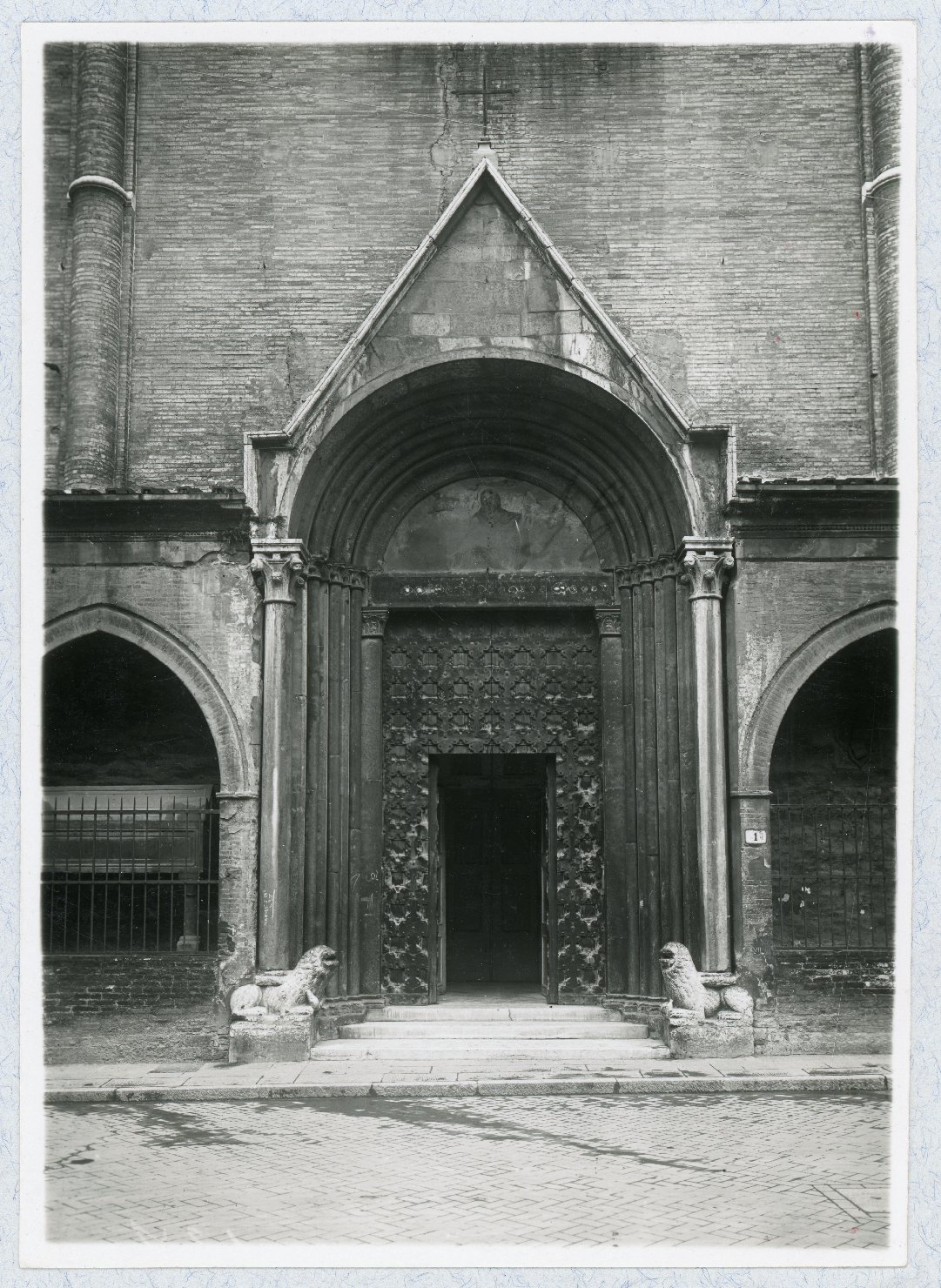 - NOTIZIE STORICO CRITICHE Le stampe alla gelatina P_000741 e P_000742 derivano dallo stesso negativo: sono infatti due esemplari della stessa ripresa che fotografa la parte inferiore della basilica di San Giacomo Maggiore a Bologna (il portale, rispetto alla più antica immagine Mengoli P_000740, ha battenti diversi, ovvero gli stessi che a tutt'oggi chiudono l'entrata principale). I dati autoriali e cronologici tratti dal suporto secondario di P_000742 sono estesi a P_000741. Di fondazione duecentesca, la basilica degli agostiniani di Bologna intotolata all’apostolo Giacomo Maggiore, divenne nel XV secolo la chiesa gentilizia dei Bentivoglio, signori della città prima del passaggio allo Stato della Chiesa. In merito agli interventi conservativi che interessarono il complesso si precisa un restauro negli anni Venti dell’Ottocento del portico bentivolesco affacciato su via Zamboni, già strada San Donato; in quell’occasione vennero alla luce le celle sepolcrali occluse sul fianco sinistro della chiesa, ma oltre alla scoperta non si procedette con ulteriori lavori (la scoperta non diede però impulso a nuovi lavori di ripristino se nel 1886 le sepolture vennero nuovamente esaminate e richiuse: soltanto nel 1962-1963 furono oggetto di un definitivo recupero; vedi Aprato 1967, p. 67). In seguito, nel 1901 l’edicoletta posta sulla cuspide di facciata, contenente la statua del santo apostolo, venne ripristinata a livello statico (Faccioli 1901, pp. 17-18). Dal principio del Novecento in avanti gli interventi s’intensificarono: 1906 demolizione del portico tardocinquecentesco addossato alle mura del Mille verso piazza Verdi; 1914-1915 scoprimento delle cupole del coperto (rifinite da embrici e squame in cotto); 1950 restauro delle finestre delle cappelle radiali con integrazione delle ghiere in cotto e con apertura di quelle tamponate; 1953-1954 ripristino del rosone della facciata; 1962-1963, oltre al sopra citato recupero delle celle sepolcrali, fu restaurato dell’oratorio di Santa Cecilia; 1964-1966 tinteggiatura di buona parte dell’interno