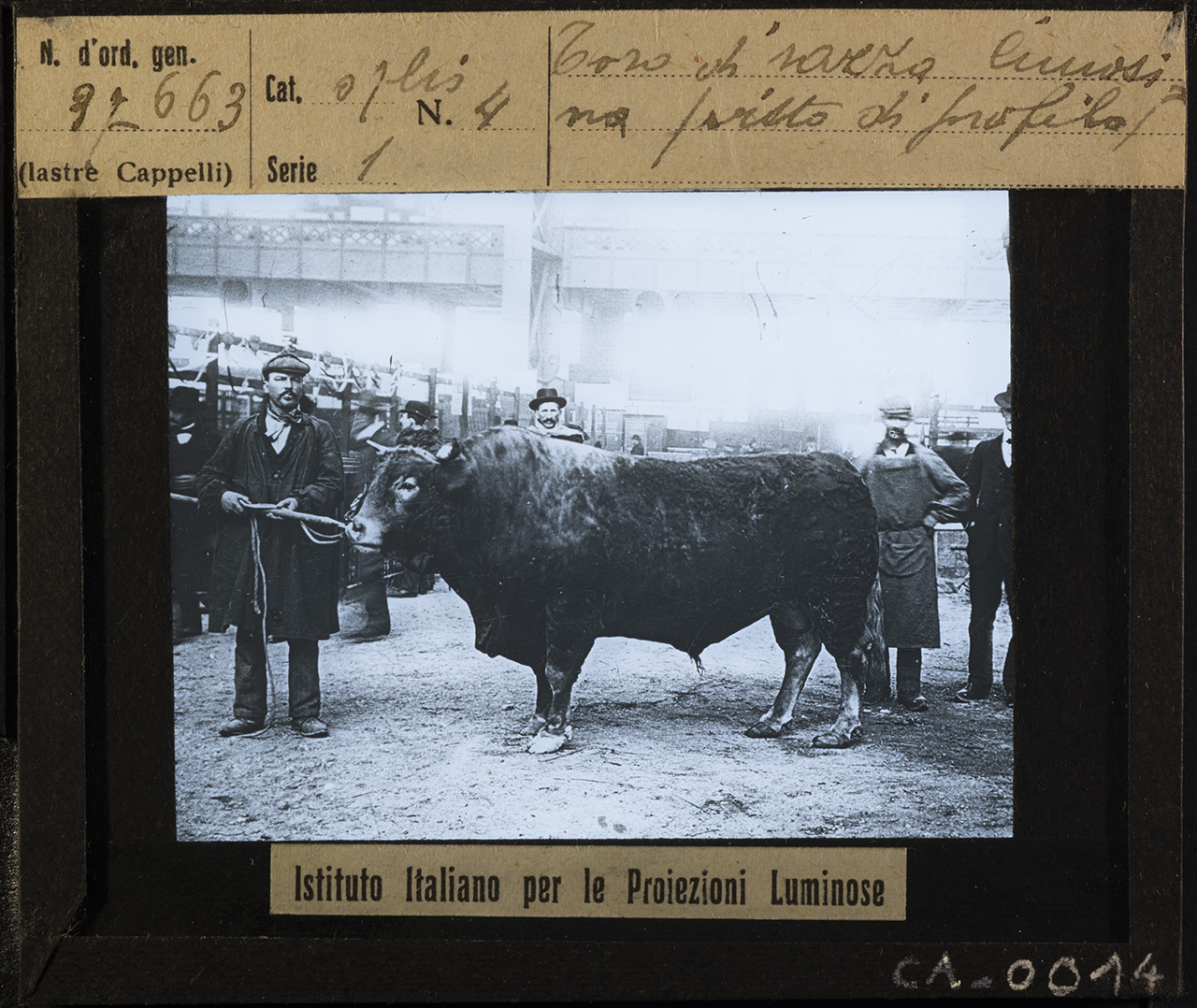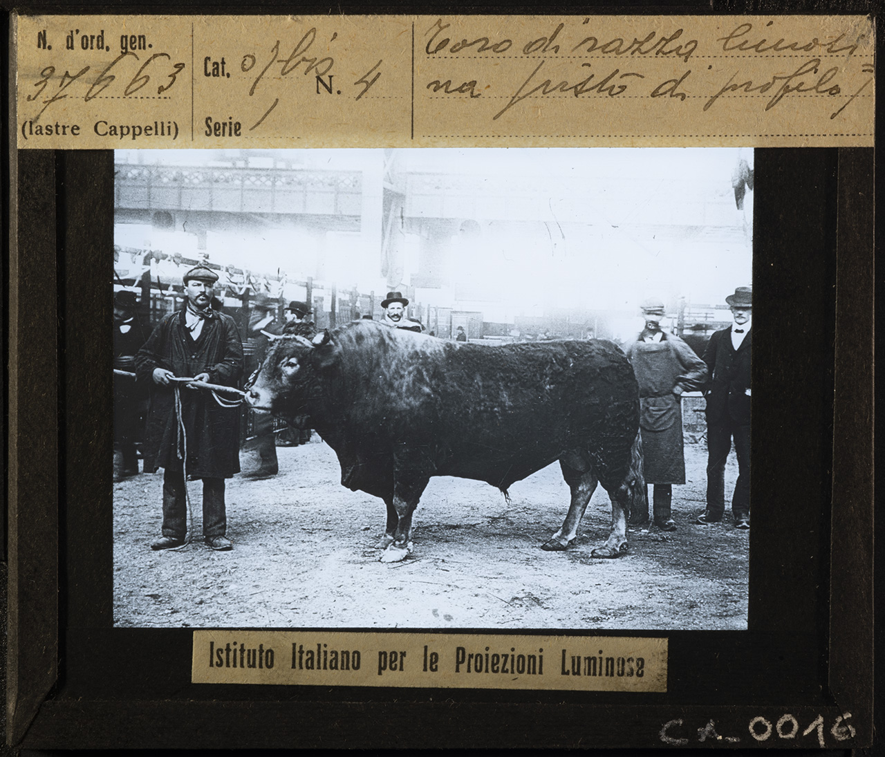 - ISCRIZIONI MCCBO_CA_0014: recto: in alto - N. d'ord. gen. / 37663/ (lastre Cappelli) // Cat. 07 bis N. 4 / Serie 1 // Toro di razza limosi= / na (visto di profilo) - corsivo -