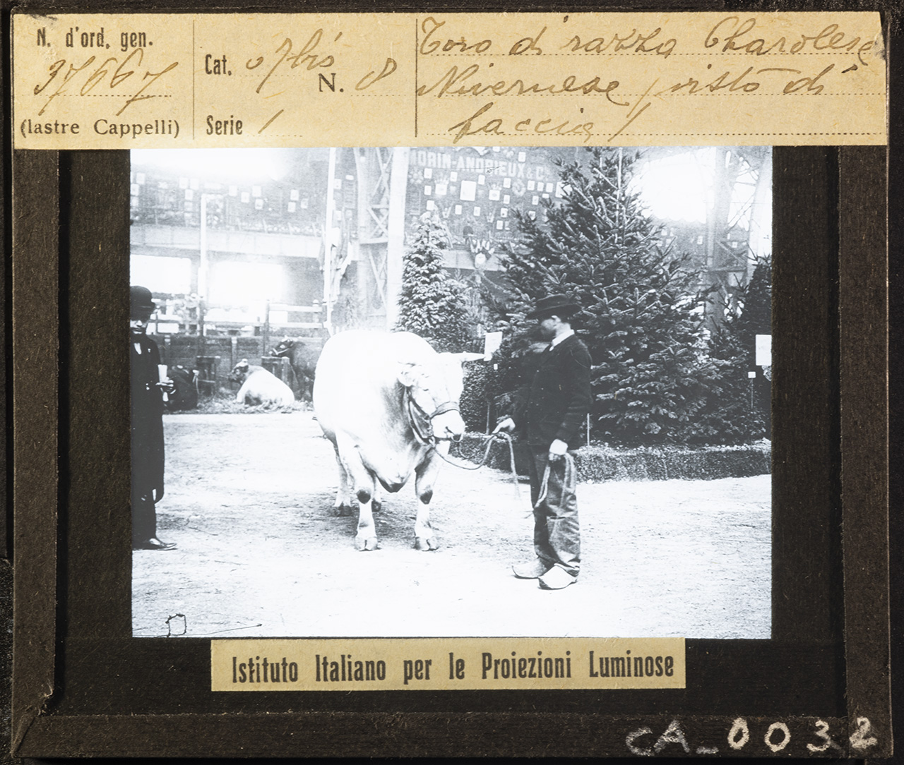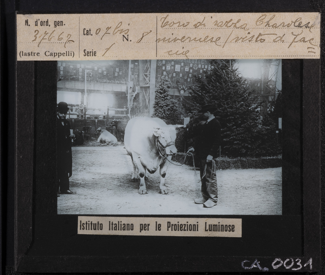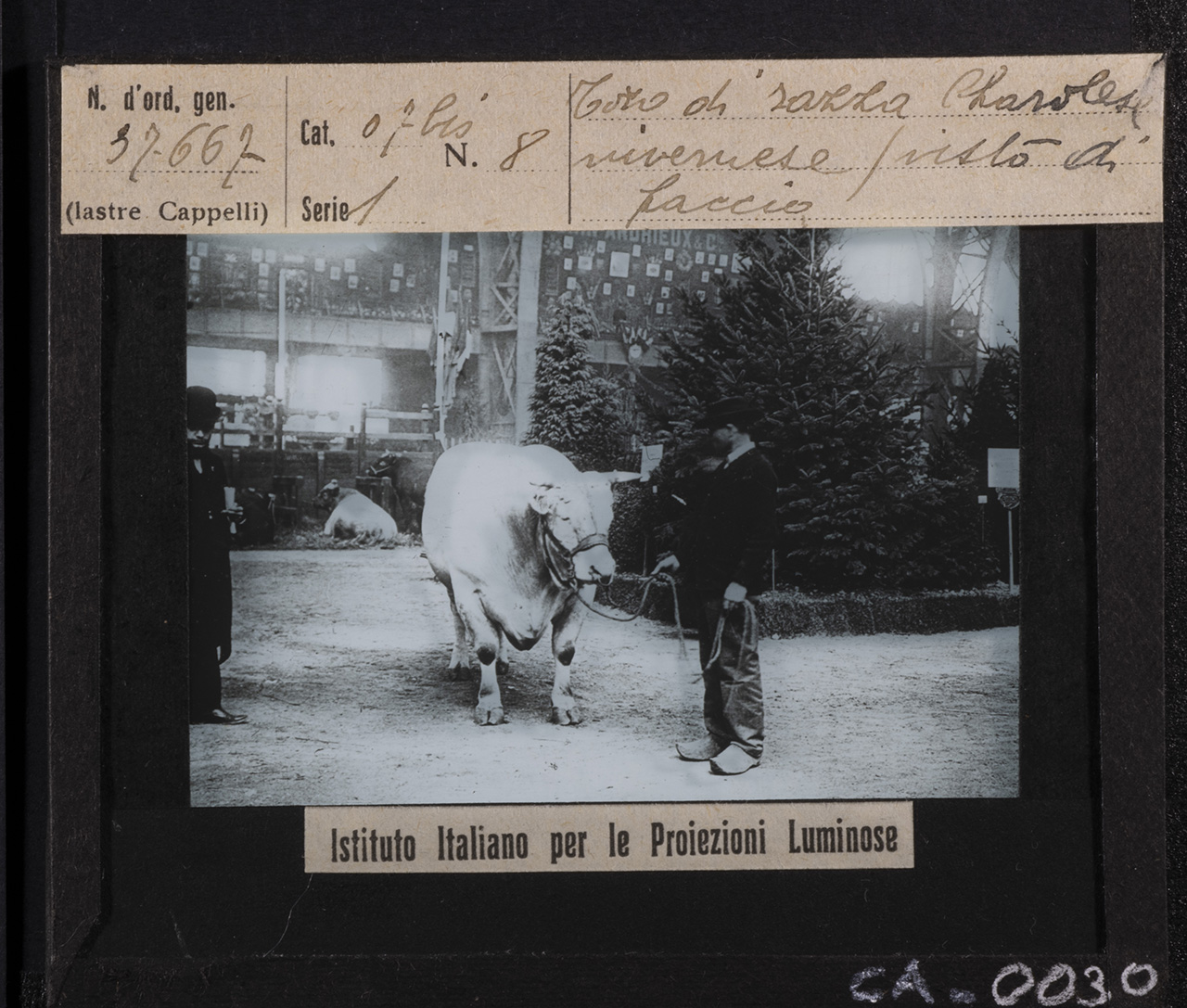 - ISCRIZIONI MCCBO_CA_0030: recto: in alto - N. d'ord. gen. / 37667 / (lastre Cappelli) // Cat. 07 bis N. 8 / Serie 1 // Toro di razza Charolise / nivernese (visto di / faccia - corsivo -