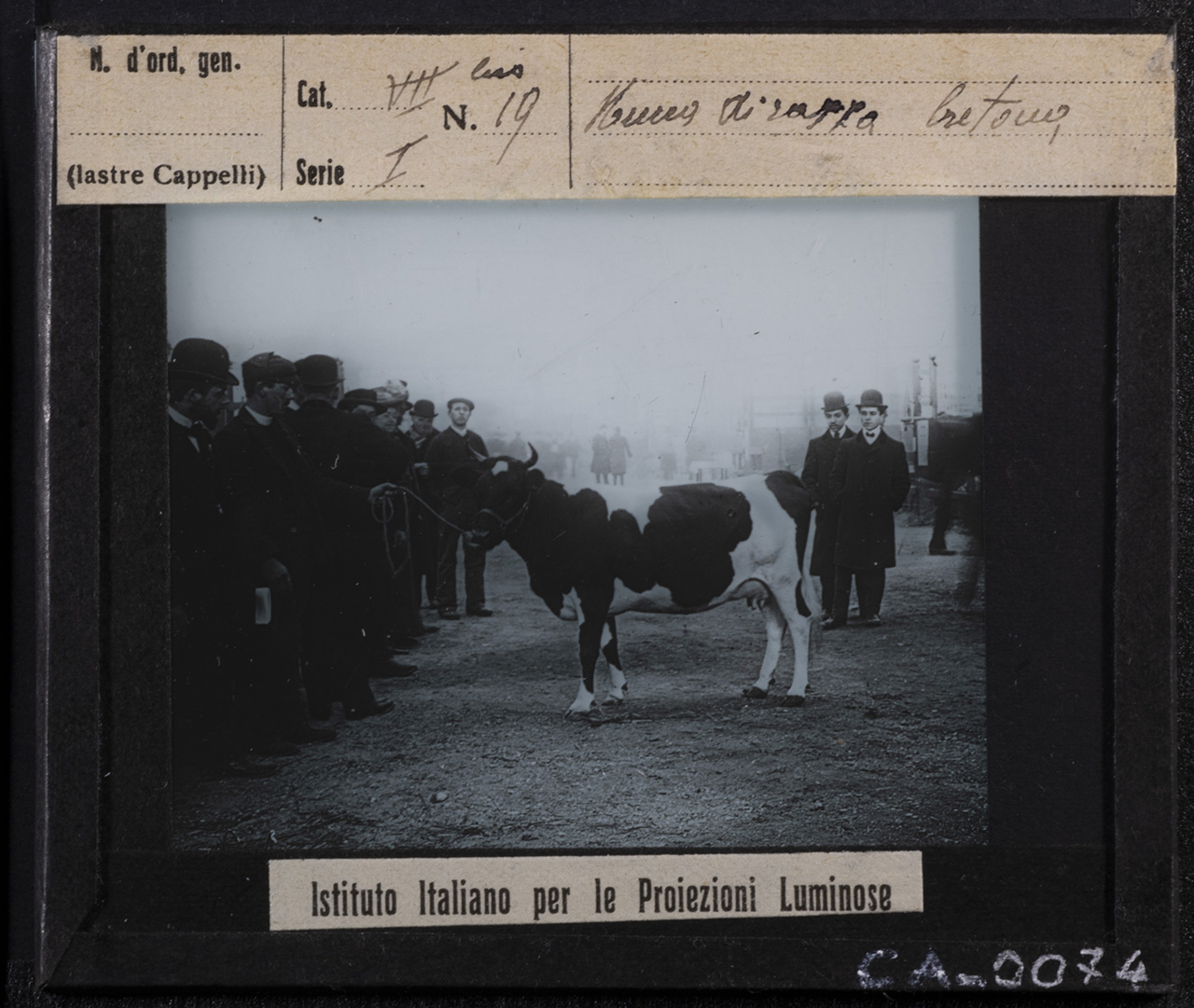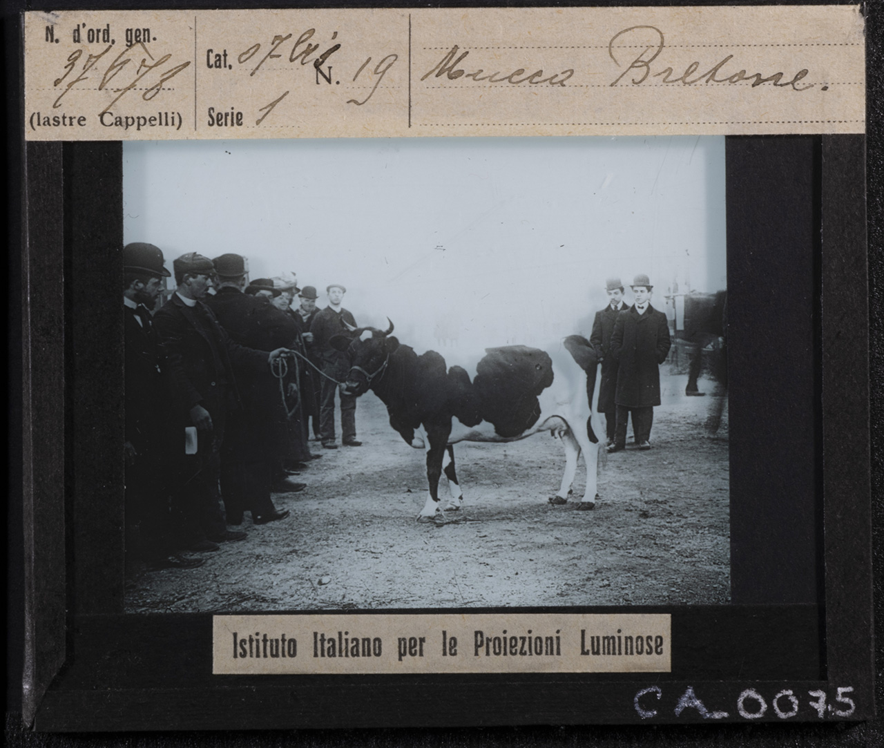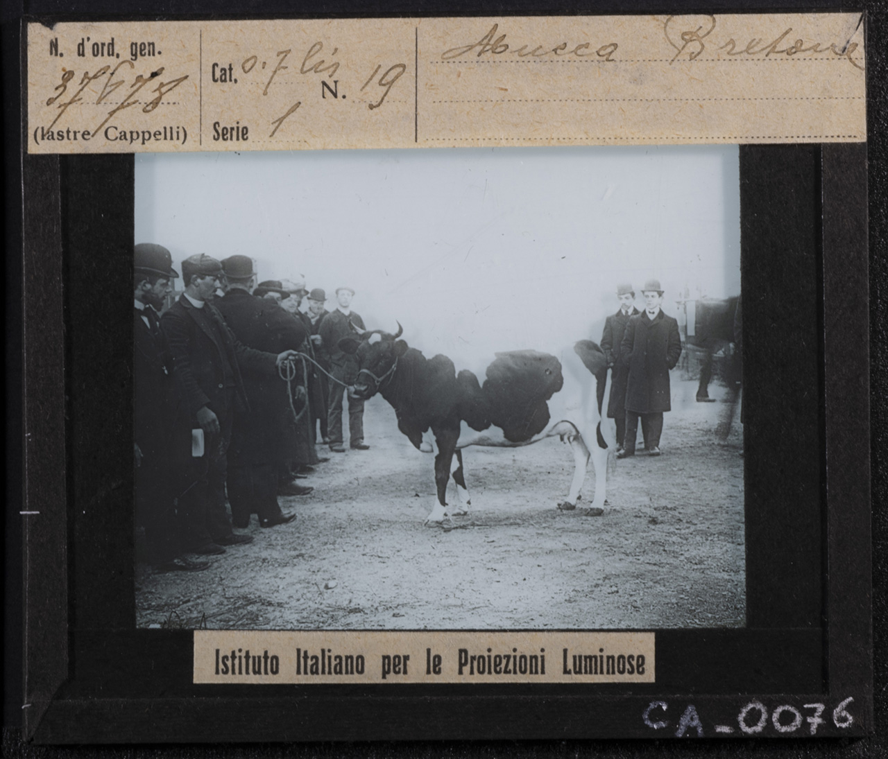 - ISCRIZIONI MCCBO_CA_0073: recto: in alto - N. d'ord. gen. / 37678 / (lastre Cappelli) // Cat. 07 bis N. 19 / Serie 1 // Mucca Bretone - corsivo -