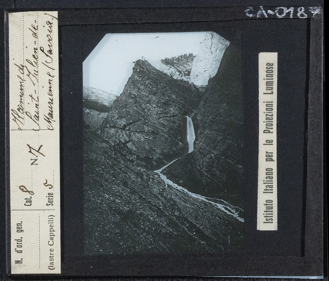 Diapositive alla gelatina bromuro d'argento su vetro, montaggio a pacchetto con lastra di protezione e carta gommata nera incollata ai quattro lati