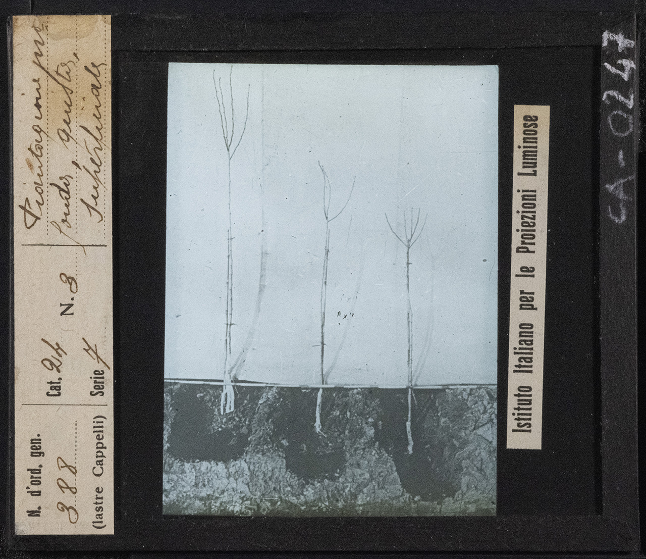 - ISCRIZIONI sull’etichetta: recto: a sinistra - d'ord. gen. / 388 / (lastre Cappelli) // Cat. 24 N. 3 / Serie 7 // Piantagione pro / fonda, giusta, / superficiale - corsivo -