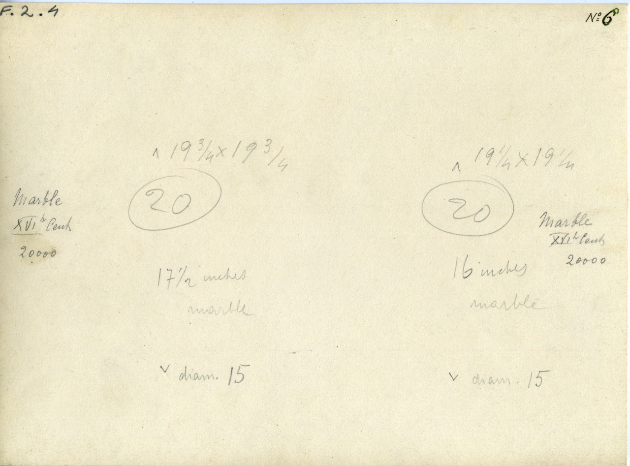 - ISCRIZIONI sul supporto primario: verso di F.2.4 - "Marble XVIth cent."/ Indicazione di stima 20.000, misure dei due capitell i : "19 3\4 x 19 3\4 x 17, 1\2 (altezza) x diam. 15. "19 1\4 x 19 1\4 x 16 (altezza) x diam. 15. In alto a destra "n° 6" - a matita - inglese