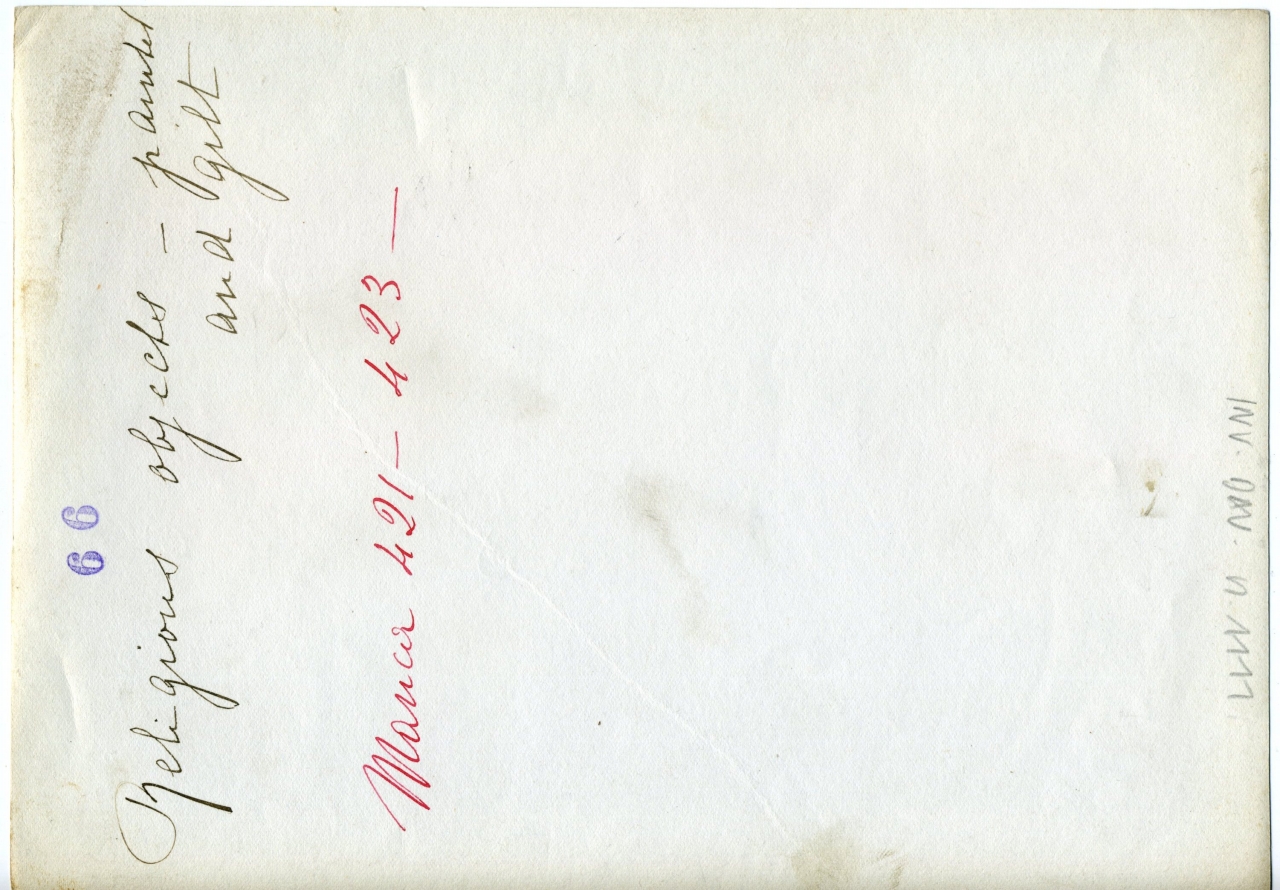 I nn. 421-427 sono scritti a penna nera ( i nn. 421 e 423 sono cerchiati di rosso), mentre i nn. 251, 3, 247, 249, 3, 250 sono scritti a penna rossa e coincidono con i nn. dei lotti sul catalogo d'asta; le immagini di questi coincidono con quelle nella fotografia in oggetto