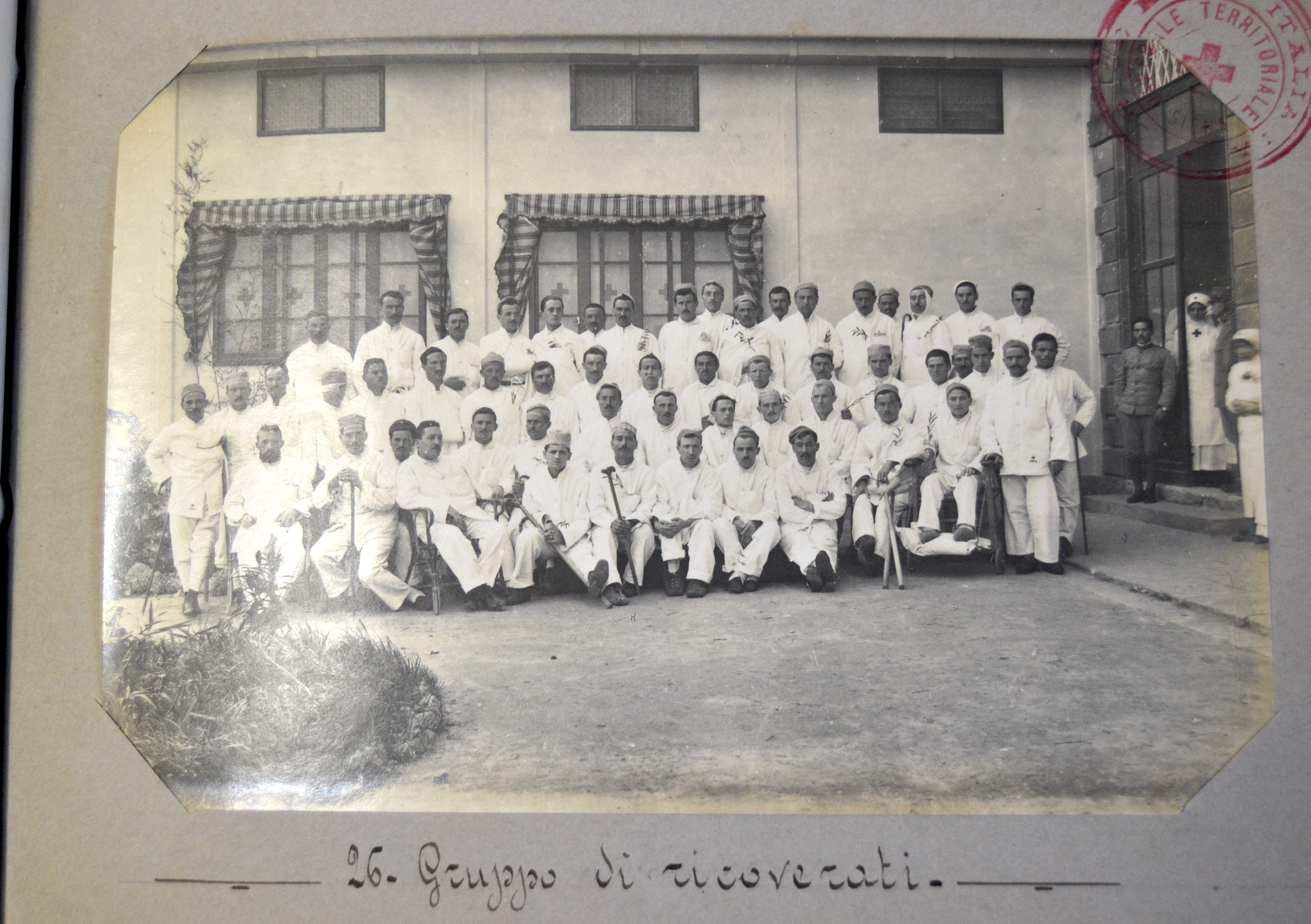 Il positivo raffigura un gruppo di ricoverati presso Palazzo al Prato, allora sede dell’Ospedale Territoriale di Siena, operante per conto della Croce Rossa Italiana. La fotografia è fermata alla pagina attraverso i 4 angoli, inseriti nelle apposite fessure ed è numerata con il n. 26, coerentemente con le indicazioni editoriali che troviamo sul verso. L'indicazione del numero di Tavola che troviamo sempre sul verso (Tav. 15), invece, non coincide con lo stato delle cose, poiché quella in oggetto è la Tavola 13. Tale aspetto rivela una certa indecisione in fase di produzione del volume