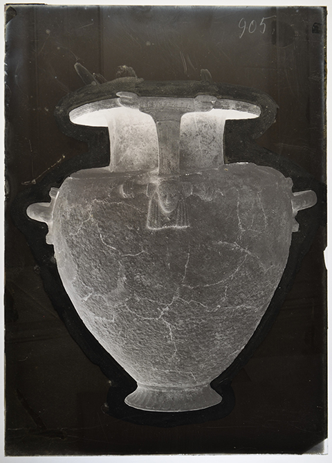 Negativo su supporto di vetro di forma rettangolare con soggetto posizionato in senso verticale. Sull’emulsione (verso) in alto a destra è manoscritto a matita il numero di archiviazione del negativo 905