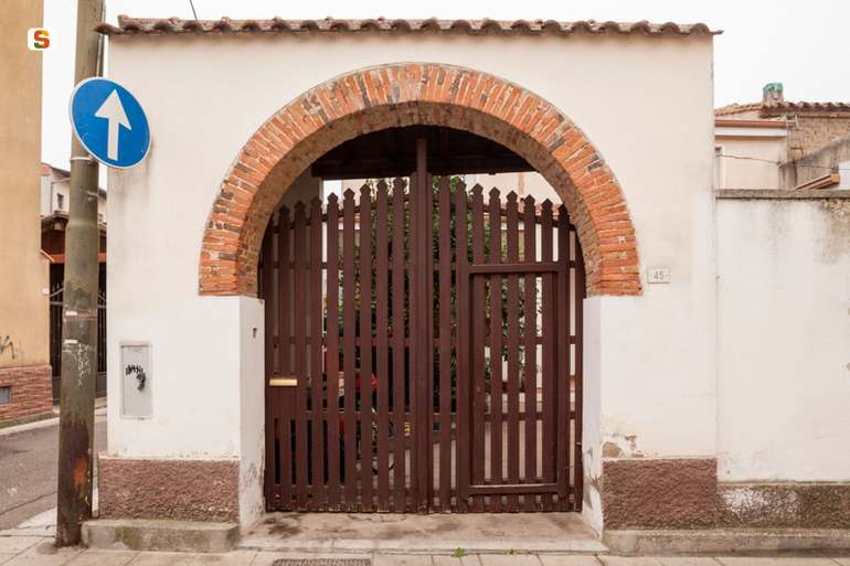 ubicato nel centro di San Gavino Monreale, il bene è uno dei portali storici del paese. Si tratta di un portale ligneo a doppia anta a protezione di un'apertura ad arco a tutto sesto. L'arco è in laterizi rossi a due teste nell'archivolto e a 4 nell'intradosso, mentre il paramento murario attorno, come i piedritti sono interamente intonacati. La struttura è coperta da una falda a bassa pendenza ed il colmo è nascosto da un muretto rivestito nella parte superiore da coppi. Il portale ha una struttura dei battenti a doghe verticali semiaccostate ad aria passante, con singoli terminali sagomati e parte superiore libera, montate su un telaio interno e presenta superfici delle assi trattate con vernice marrone. Una cornice in rilievo delimita il profilo di un rettangolo destinato per l'ingresso pedonale. Il portale ha affaccio diretto su strada per un'altezza di 3,10 metri per 2,57 di larghezza.